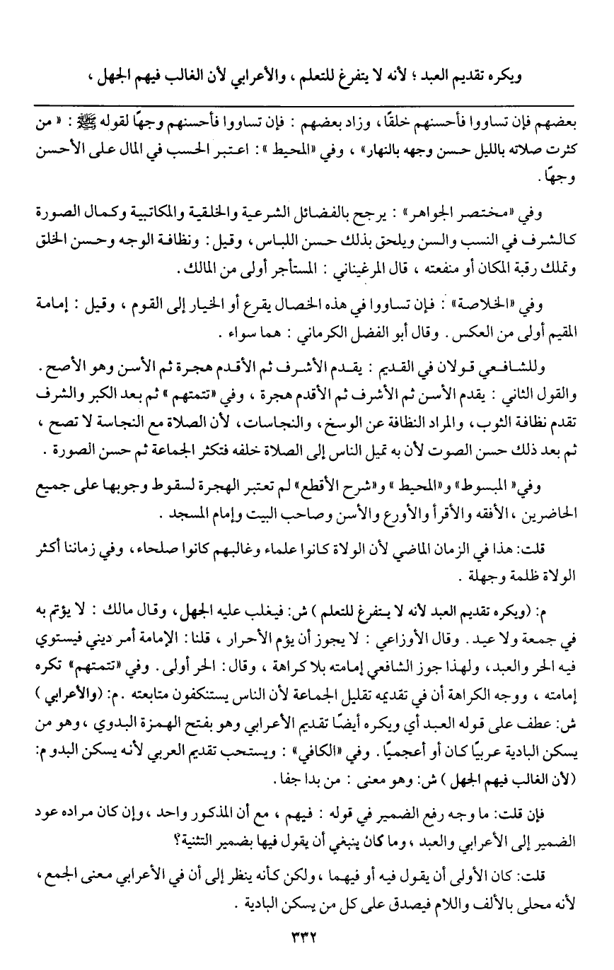 م: (ويكره تقديم العبد؛ لأنه لا يتفرغ للتعلم) ش: فيغلب عليه الجهل، وقال مالك: لا يؤتم به في جمعة ولا عيد. وقال الأوزاعي: لا يجوز أن يؤم الأحرار، قلنا: الإمامة أمر ديني فيستوي فيه الحر والعبد، ولهذا جوز الشافعي إمامته بلا كراهة، وقال: الحر أولى.