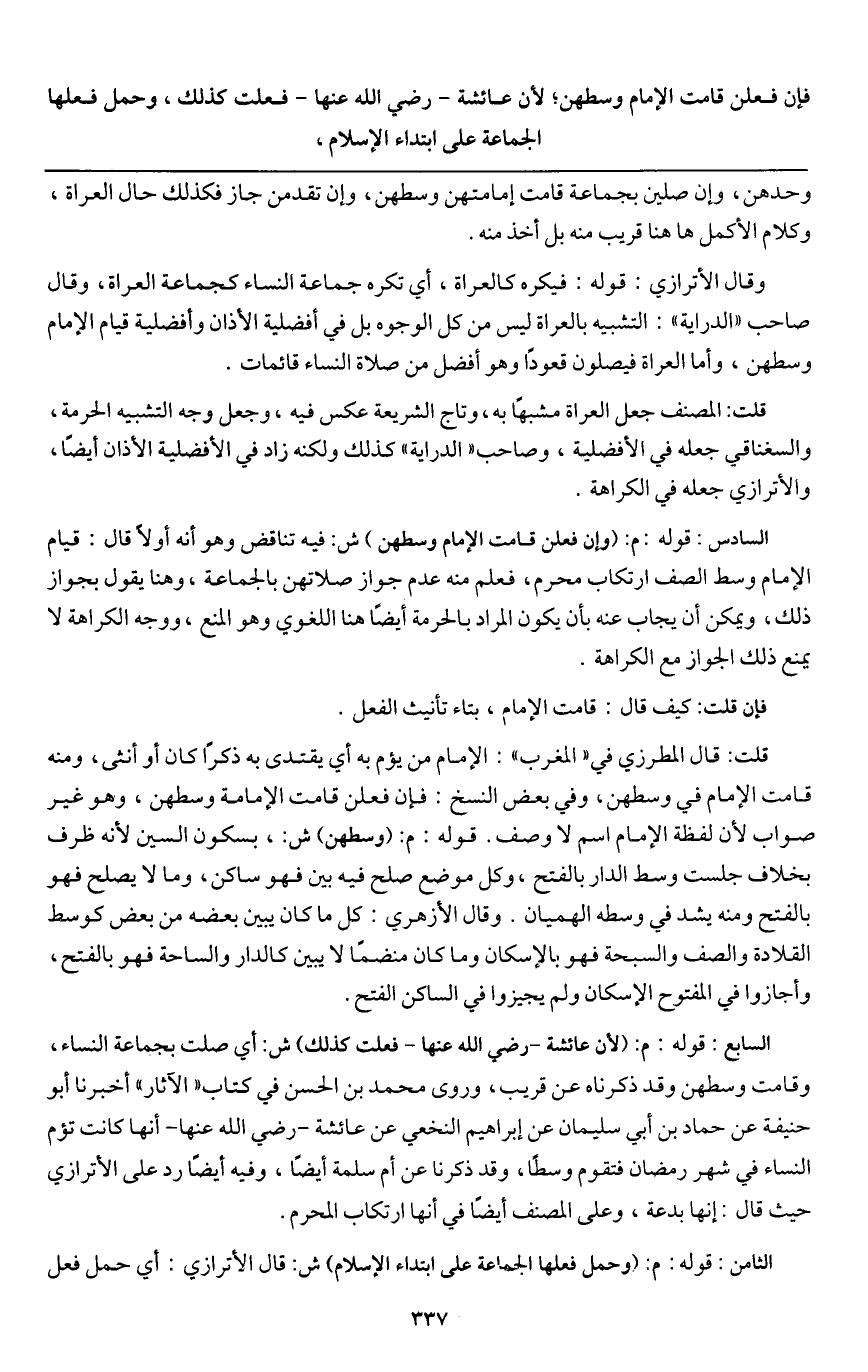 السادس: قوله: م: (وإن فعلن قامت الإمام وسطهن) ش: فيه تناقض وهو أنه أولا قال: قيام الإمام وسط الصف ارتكاب محرم، فعلم منه عدم جواز صلاتهن بالجماعة، وهنا يقول بجواز ذلك، ويمكن أن يجاب عنه بأن يكون المراد بالحرمة أيضا هنا اللغوي وهو المنع، ووجه الكراهة لا يمنع ذلك الجواز مع الكراهة.