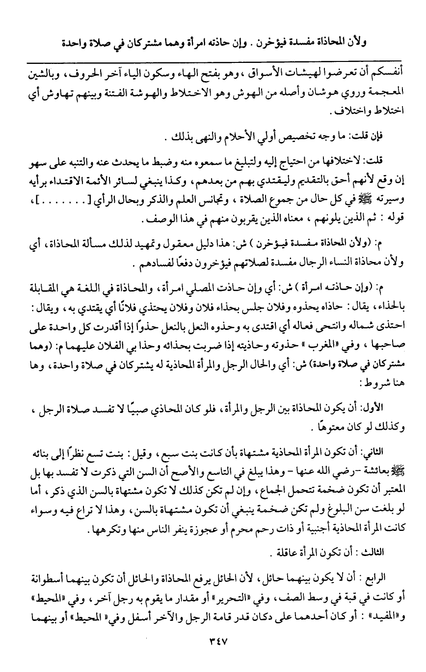 الرابع: أن لا يكون بينهما حائل؛ لأن الحائل يرفع المحاذاة والحائل أن تكون بينهما أسطوانة أو كانت في قبة في وسط الصف، وفي " التحرير " أو مقدار ما يقوم به رجل آخر، وفي " المحيط " و " المفيد ": أو كان أحدهما على دكان قدر قامة الرجل والآخر أسفل وفي " المحيط " أو بينهما