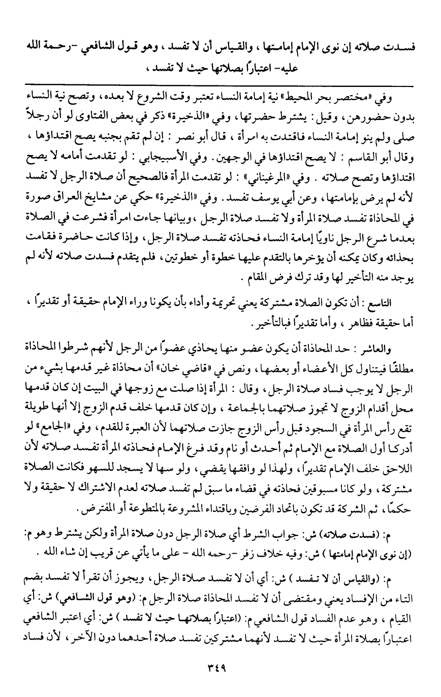 ـــــــــــــــــــــــــــــQوفي " مختصر بحر المحيط " نية إمامة النساء تعتبر وقت الشروع لا بعده، وتصح نية النساء بدون حضورهن، وقيل: يشترط حضرتها، وفي " الذخيرة " ذكر في بعض الفتاوى لو أن رجلا صلى ولم ينو إمامة النساء فاقتدت به امرأة، قال أبو نصر: إن لم تقم بجنبه يصح اقتداؤها، وقال أبو القاسم: لا يصح اقتداؤها في الوجهين. وفي الأسبيجابي: لو تقدمت أمامه لا يصح اقتداؤها وتصح صلاته.