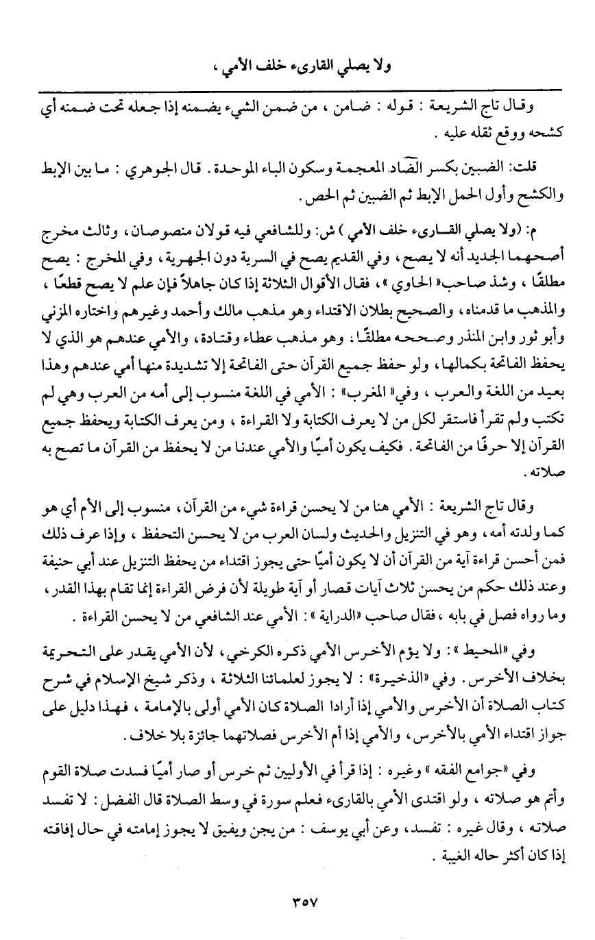 وقال تاج الشريعة: الأمي هنا من لا يحسن قراءة شيء من القرآن، منسوب إلى الأم أي هو كما ولدته أمه، وهو في التنزيل والحديث ولسان العرب من لا يحسن التحفظ، وإذا عرف ذلك فمن أحسن قراءة آية من القرآن أن لا يكون أميا حتى يجوز اقتداء من يحفظ التنزيل عند أبي حنيفة وعند ذلك حكم من يحسن ثلاث آيات قصار أو آية طويلة؛ لأن فرض القراءة إنما تقام بهذا القدر، وما رواه فصل في بابه، فقال صاحب " الدراية ": الأمي عند الشافعي من لا يحسن القراءة.