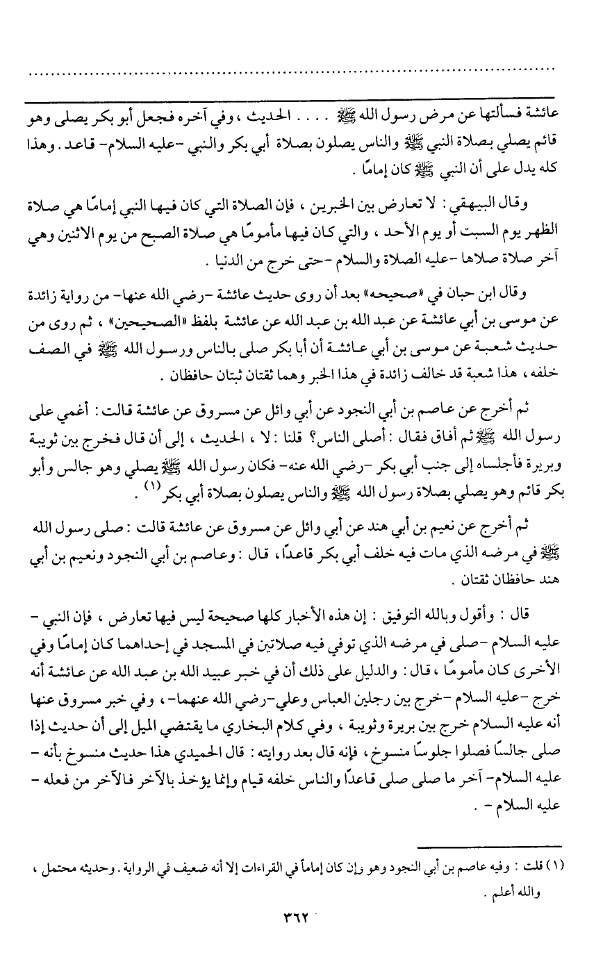 ثم أخرج عن نعيم بن أبي هند عن أبي وائل عن مسروق عن عائشة قالت: صلى «رسول الله - صَلَّى اللَّهُ عَلَيْهِ وَسَلَّمَ - في مرضه الذي مات فيه خلف أبي بكر قاعدا» قال: وعاصم بن أبي النجود ونعيم بن أبي هند حافظان ثقتان.