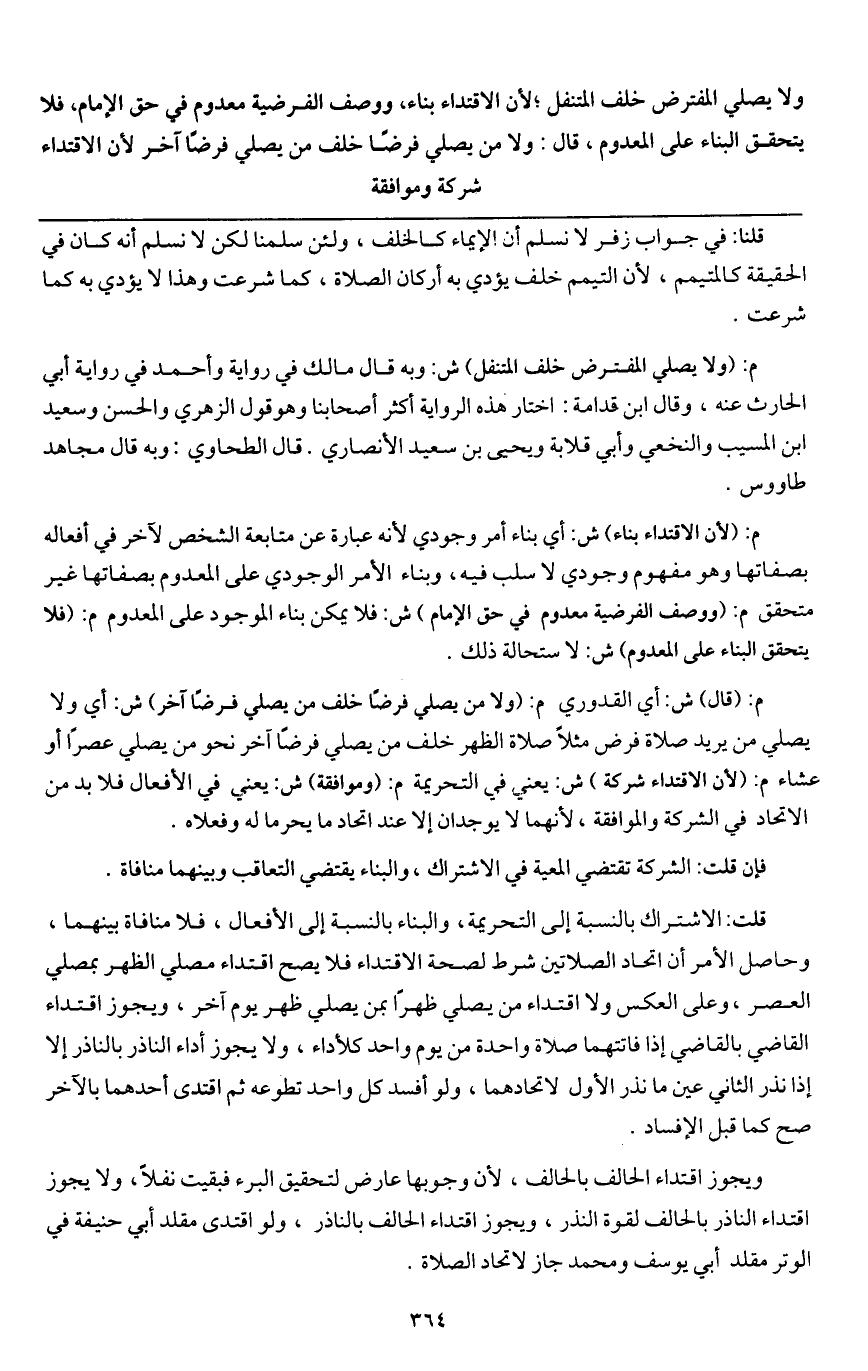 ولا يصلي المفترض خلف المتنفل؛ لأن الاقتداء بناء، ووصف الفرضية معدوم في حق الإمام، فلا يتحقق البناء على المعدوم، قال: ولا من يصلي فرضا خلف من يصلي فرضا آخر؛ لأن الاقتداء شركة وموافقة