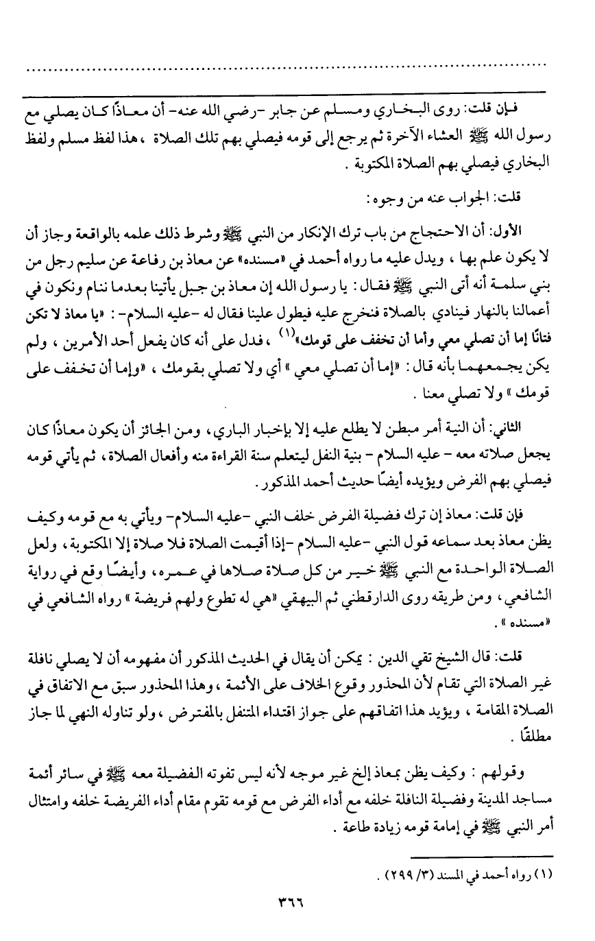 وقولهم: وكيف يظن بمعاذ إلخ غير موجه؛ لأنه ليس تفوته الفضيلة معه - صَلَّى اللَّهُ عَلَيْهِ وَسَلَّمَ - في سائر أئمة مساجد المدينة وفضيلة النافلة خلفه مع أداء الفرض مع قومه تقوم مقام أداء الفريضة خلفه وامتثال أمر النبي - صَلَّى اللَّهُ عَلَيْهِ وَسَلَّمَ - في إمامة قومه زيادة طاعة.