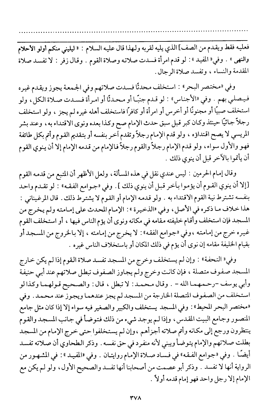 وفي " التحفة ": وإن لم يستخلف وخرج من المسجد تفسد صلاة القوم إذا لم يكن خارج المسجد صفوف متصلة، فإن كانت وخرج ولم يجاوز الصفوف تبطل صلاتهم عند أبي حنيفة وأبي يوسف - رحمهما الله -. وقال محمد: لا تبطل، قال: والصحيح قولهما وكذا لو استخلف من الصفوف المتصلة الخارجة من المسجد لم يجز عندهما ويجوز عند محمد. وفي " مختصر البحر المحيط ": وفي المسجد يستخلف والكبير والصغير فيه سواء إلا إذا كان مثل جامع المنصور وجامع البيت المقدس، وإذا لم يوجد شيء من ذلك فتوضأ في جانب المسجد والقوم ينتظرون ورجع إلى مكانه وأتم صلاته أجزأهم، وإن لم يستخلفوا حتى خرج الإمام من المسجد بطلت صلاتهم والإمام يتوضأ ويبني؛ لأنه منفرد في حق نفسه. ذكر الطحاوي أن صلاته تفسد أيضا. وفي " جوامع الفقه " في فساد صلاة الإمام روايتان. وفي " المفيد ": في المشهور من الرواية أنها لا تفسد. وذكر أبو عصمت من أصحابنا أنها تفسد والصحيح الأول، ولو لم يكن مع الإمام إلا رجل واحد فهو إمام قدمه أولا.