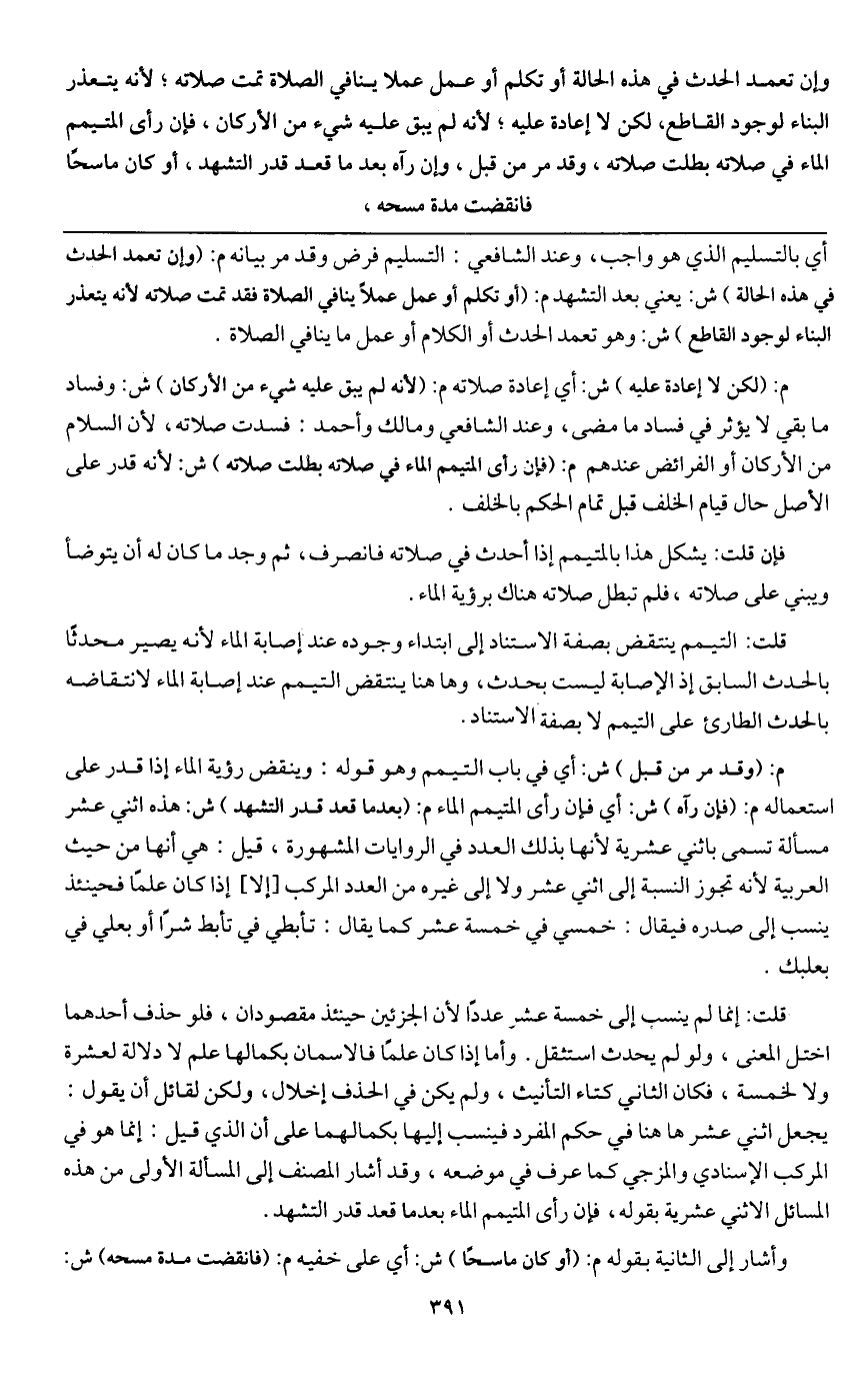 قلت: إنما لم ينسب إلى خمسة عشر عددا؛ لأن الجزأين حينئذ مقصودان، فلو حذف أحدهما اختل المعنى، ولو لم يحدث استثقل. وأما إذا كان علما فالاسمان بكمالها علم لا دلالة لعشرة ولا لخمسة، فكان الثاني كتاء التأنيث، ولم يكن في الحذف إخلال، ولكن لقائل أن يقول: يجعل اثني عشر هاهنا في حكم المفرد فينسب إليها بكمالهما على أن الذي قيل: إنما هو في المركب الإسنادي والمزجي كما عرف في موضعه، وقد أشار المصنف إلى المسألة الأولى من هذه المسائل الاثني عشرية بقوله، فإن رأى المتيمم الماء بعدما قعد قدر التشهد.