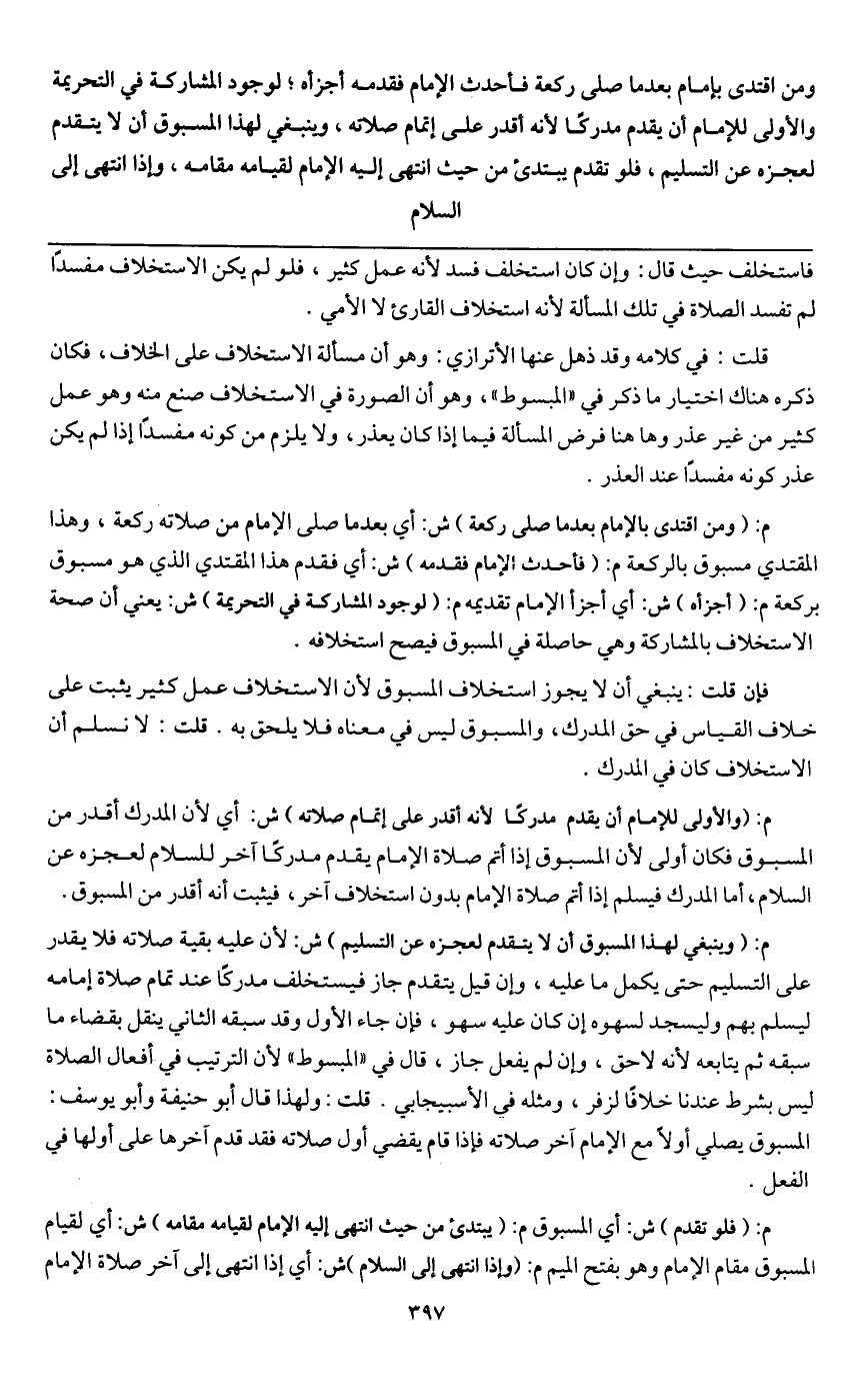 ـــــــــــــــــــــــــــــQفاستخلف حيث قال: وإن كان استخلف فسد لأنه عمل كثير، فلو لم يكن الاستخلاف مفسدا لم تفسد الصلاة في تلك المسألة لأنه استخلف القارئ لا الأمي.