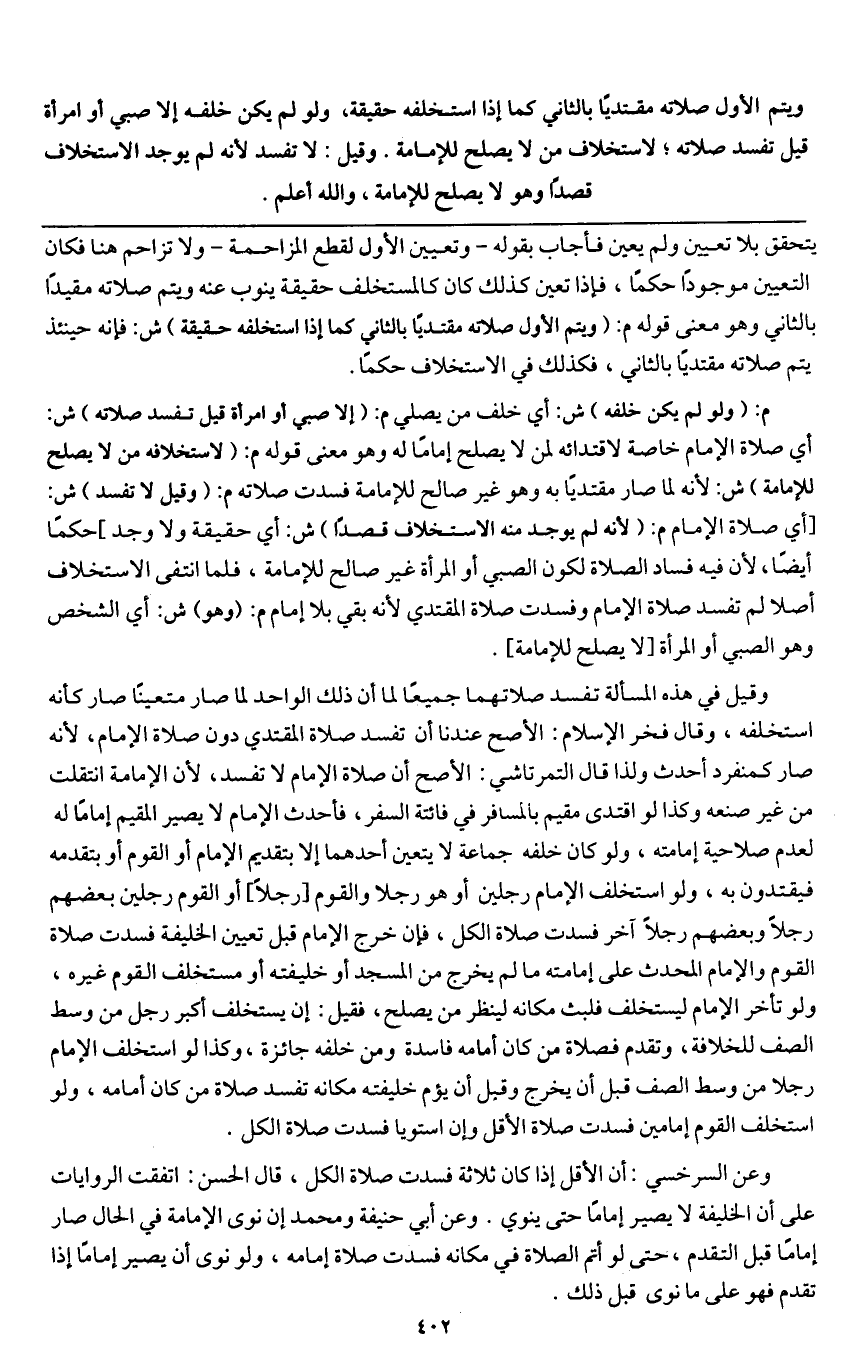 وعن السرخسي: أن الأقل إذا كان ثلاثة فسدت صلاة الكل، قال الحسن اتفقت الروايات على أن الخليفة لا يصير إماما حتى ينوي. وعن أبي حنيفة ومحمد إن نوى الإمامة في الحال صار إماما قبل التقدم، حتى لو أتم الصلاة في مكانه فسدت صلاة إمامه، ولو نوى أن يصير إماما إذا تقدم فهو على ما نوى قبل ذلك.