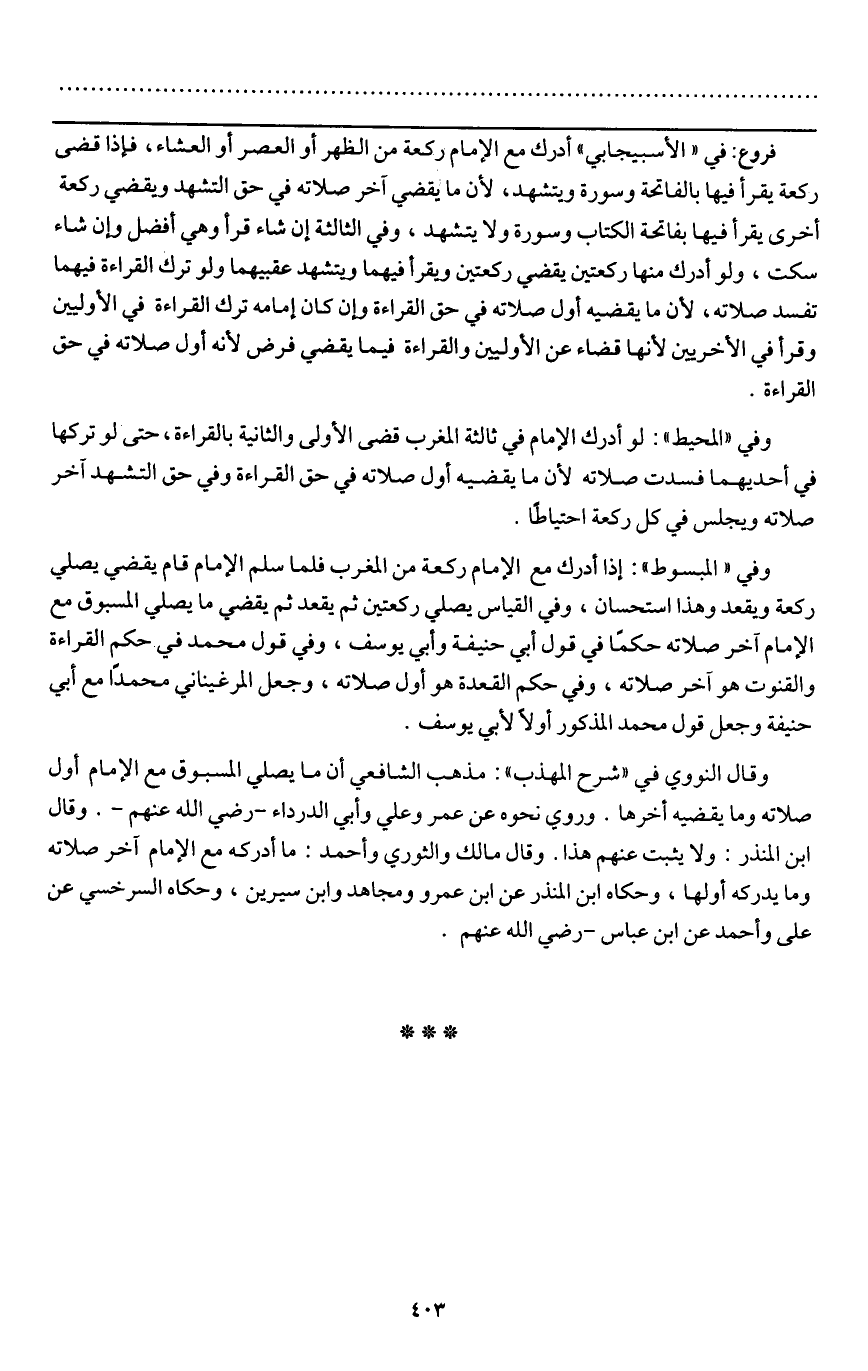 وقال النووي في " شرح المهذب ": مذهب الشافعي أن ما يصلي المسبوق مع الإمام أول صلاته وما يقضيه آخرها. وروي نحوه عن عمر وعلي وأبي الدرداء - رَضِيَ اللَّهُ عَنْهُمْ -. وقال ابن المنذر: ولا يثبت عنهم هذا. وقال مالك والثوري وأحمد: ما أدركه مع الإمام آخر صلاته وما يدركه أولها، وحكاه ابن المنذر عن ابن عمرو ومجاهد وابن سيرين، وحكاه السرخسي عن علي وأحمد عن ابن عباس - رَضِيَ اللَّهُ عَنْهُمْ -.