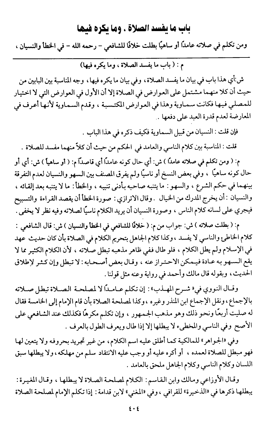 باب ما يفسد الصلاة، وما يكره فيها ومن تكلم في صلاته عامدا أو ساهيا بطلت خلافا للشافعي - رَحِمَهُ اللَّهُ - في الخطأ والنسيان،
