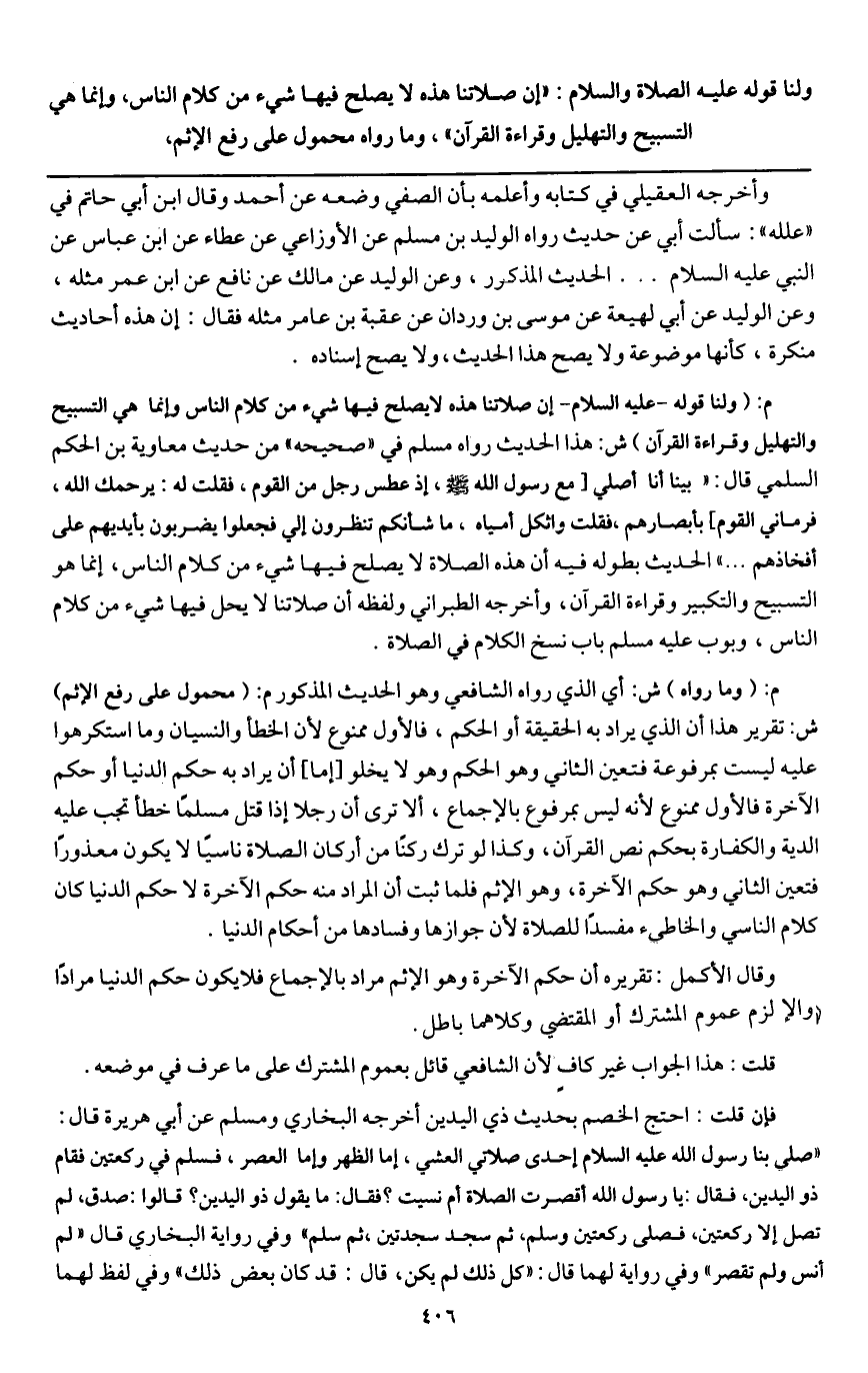 ولنا قوله - عَلَيْهِ الصَّلَاةُ وَالسَّلَامُ -: «إن صلاتنا هذه لا يصلح فيها شيء من كلام الناس، وإنما هي التسبيح والتهليل وقراءة القرآن» ، وما رواه محمول على رفع الإثم،