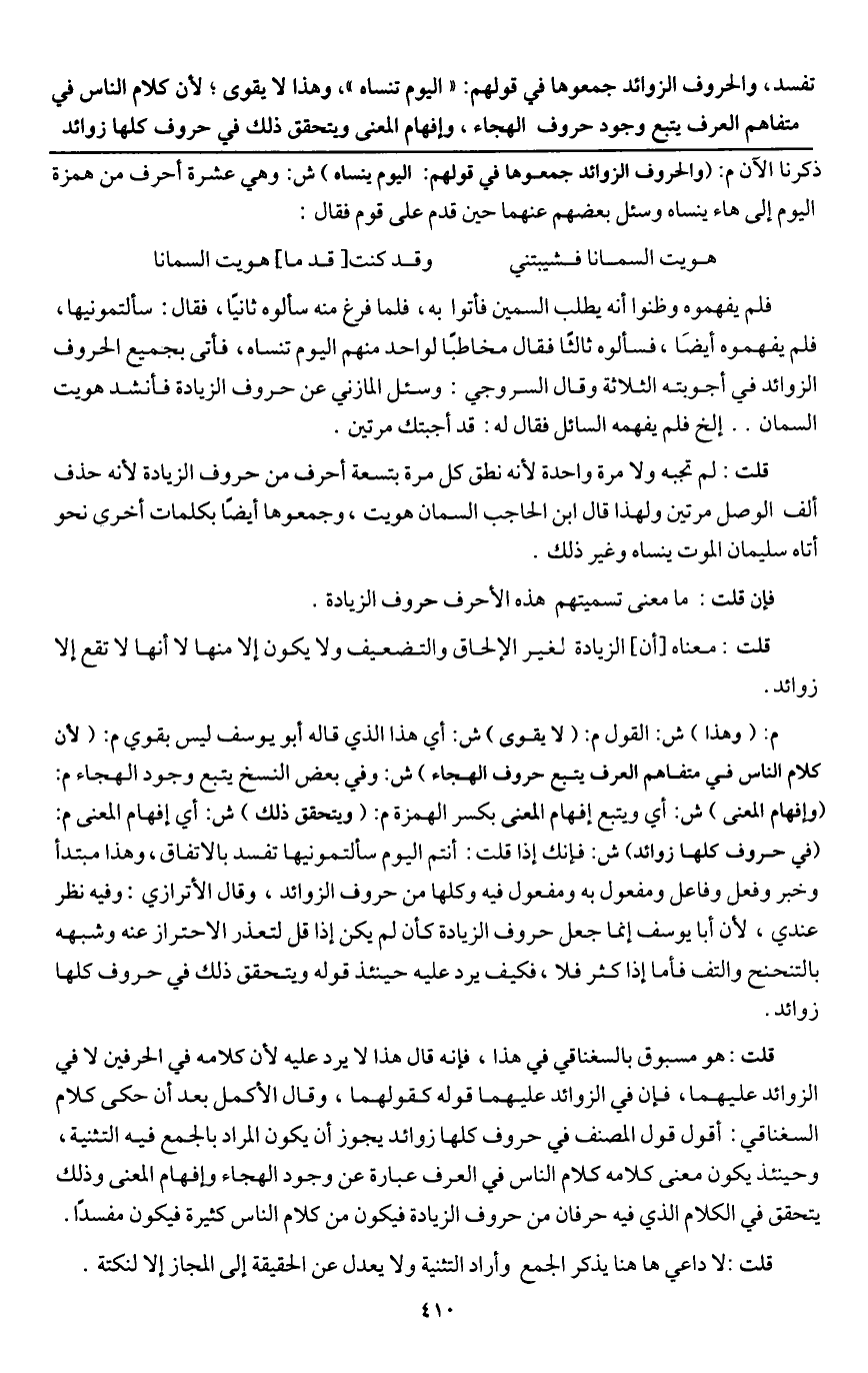فلم يفهموه وظنوا أنه يطلب السمين فأتوا به، فلما فرغ منه سألوه ثانيا، فقال: سألتمونيها، فلم يفهموه أيضا، فسألوه ثالثا، فقال مخاطبا لواحد منهم: اليوم تنساه، فأتى بجميع الحروف الزوائد في أجوبته الثلاثة، وقال السروجي: وسئل المازني عن حروف الزيادة، فأنشد: هويت السمان.. إلخ فلم يفهمه السائل فقال له: قد أجبتك مرتين.