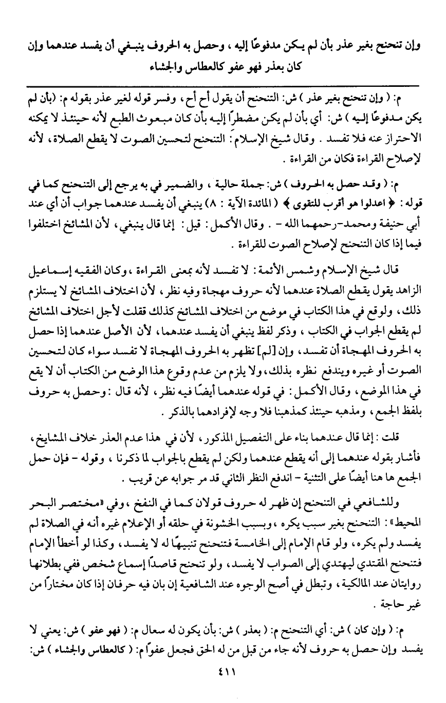 م: (وإن تنحنح بغير عذر) ش: التنحنح أن يقول: أح أح، وفسر قوله: لغير عذر بقوله م: (بأن لم يكن مدفوعا إليه) ش: أي بأن لم يكن مضطرا إليه بأن كان مبعوث الطبع؛ لأنه حينئذ لا يمكنه الاحتراز عنه فلا تفسد. وقال شيخ الإسلام: التنحنح لتحسين الصوت لا يقطع الصلاة؛ لأنه لإصلاح القراءة فكان من القراءة.