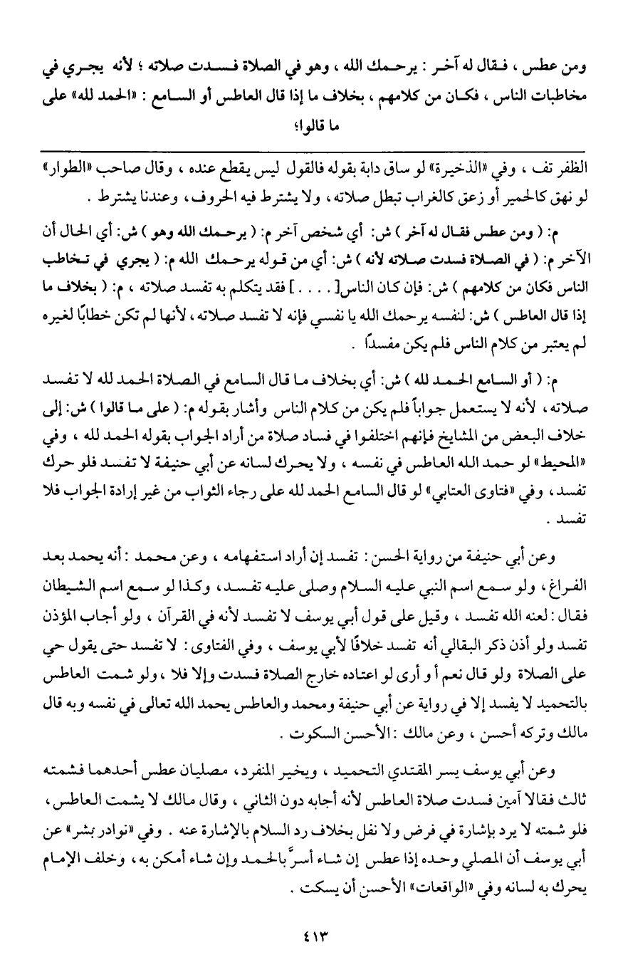 ومن عطس، فقال له آخر: يرحمك الله، وهو في الصلاة فسدت صلاته؛ لأنه يجري في مخاطبات الناس، فكان من كلامهم، بخلاف ما إذا قال العاطس أو السامع: " الحمد لله " على ما قالوا؛