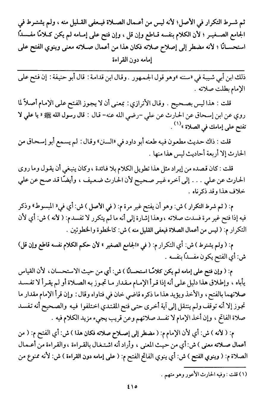 ـــــــــــــــــــــــــــــQذلك ابن أبي شيبة في " سننه " وهو قول الجمهور. وقال ابن قدامة: قال أبو حنيفة: إن فتح على الإمام بطلت صلاته.