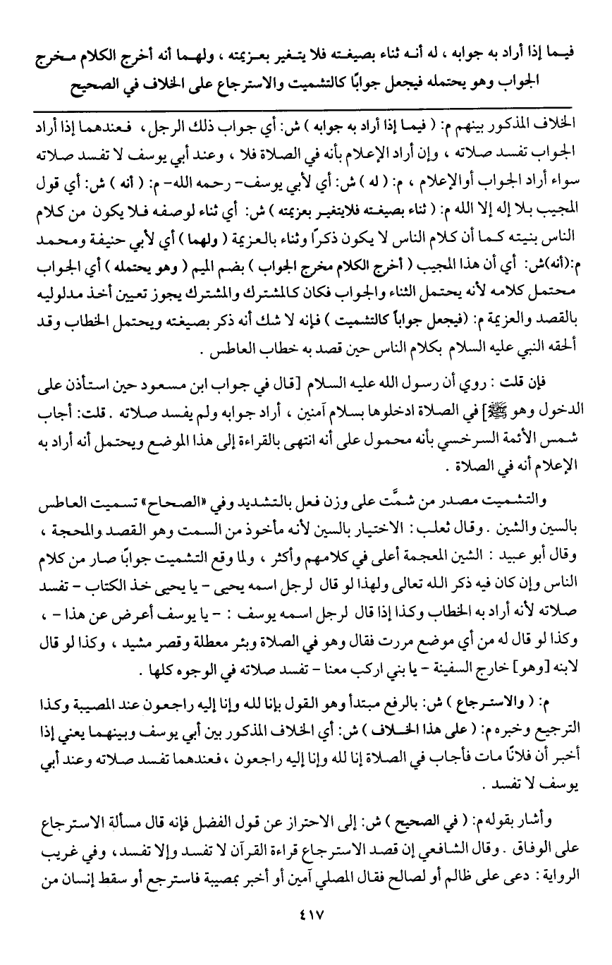 وأشار بقوله م: (في الصحيح) ش: إلى الاحتراز عن قول الفضل فإنه قال: مسألة الاسترجاع على الوفاق. وقال الشافعي: إن قصد الاسترجاع قراءة القرآن لا تفسد وإلا تفسد، وفي غريب الرواية: دُعي على ظالم أو لصالح، فقال المصلي: آمين أو أخبر بمصيبة فاسترجع أو سقط إنسان من