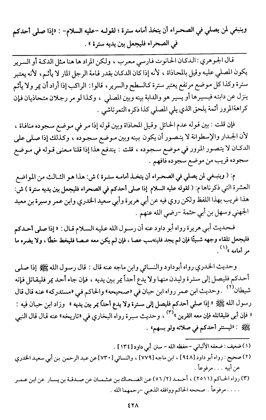 وحديث الخدري رواه أبو داود والنسائي وابن ماجه عنه قال: قال رسول الله - صَلَّى اللَّهُ عَلَيْهِ وَسَلَّمَ -: «إذا صلى أحدكم فليصل إلى سترة وليدن منها ولا يدع أحدا يمر بين يديه، فإن جاء أحد يمر فليقاتل فإنه شيطان» . وحديث ابن عمر رواه ابن حبان في " صحيحه " والحاكم في " مستدركه " عنه قال: قال رسول الله - صَلَّى اللَّهُ عَلَيْهِ وَسَلَّمَ - «إذا صلى أحدكم فليصل إلى سترة ولا يدع أحدا يمر بين يديه " وزاد ابن حبان فيه: " فإن أبى فليقاتله فإن معه القرين» ، وحديث سبرة رواه البخاري في " تاريخه " عنه قال: قال النبي - صَلَّى اللَّهُ عَلَيْهِ وَسَلَّمَ -: «ليستتر أحدكم في صلاته ولو بسهم»