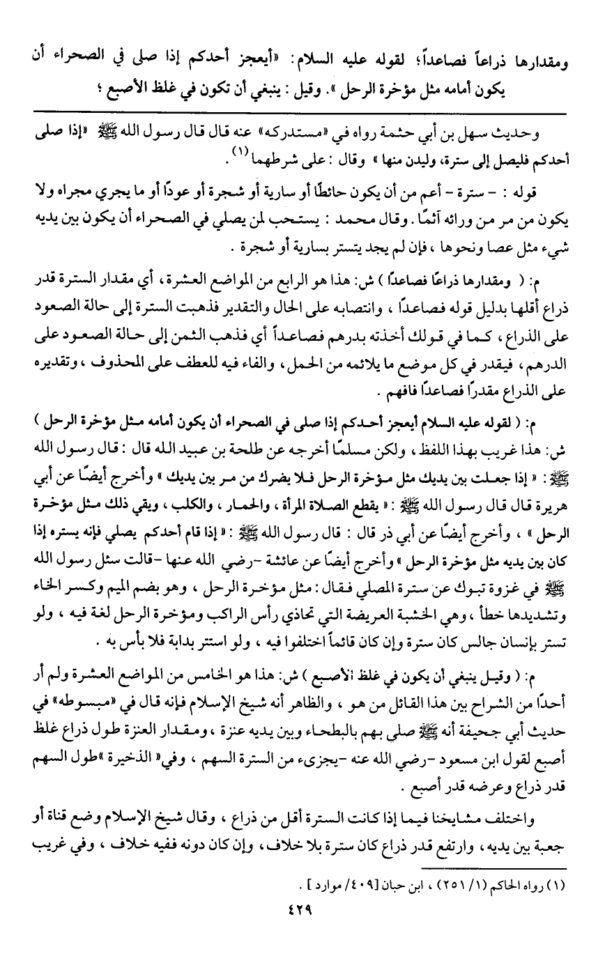 ومقدارها ذراع فصاعدا؛ لقوله - عَلَيْهِ السَّلَامُ -: «أيعجز أحدكم إذا صلى في الصحراء أن يكون أمامه مثل مؤخرة الرحل» وقيل: ينبغي أن تكون في غلظ الإصبع؛