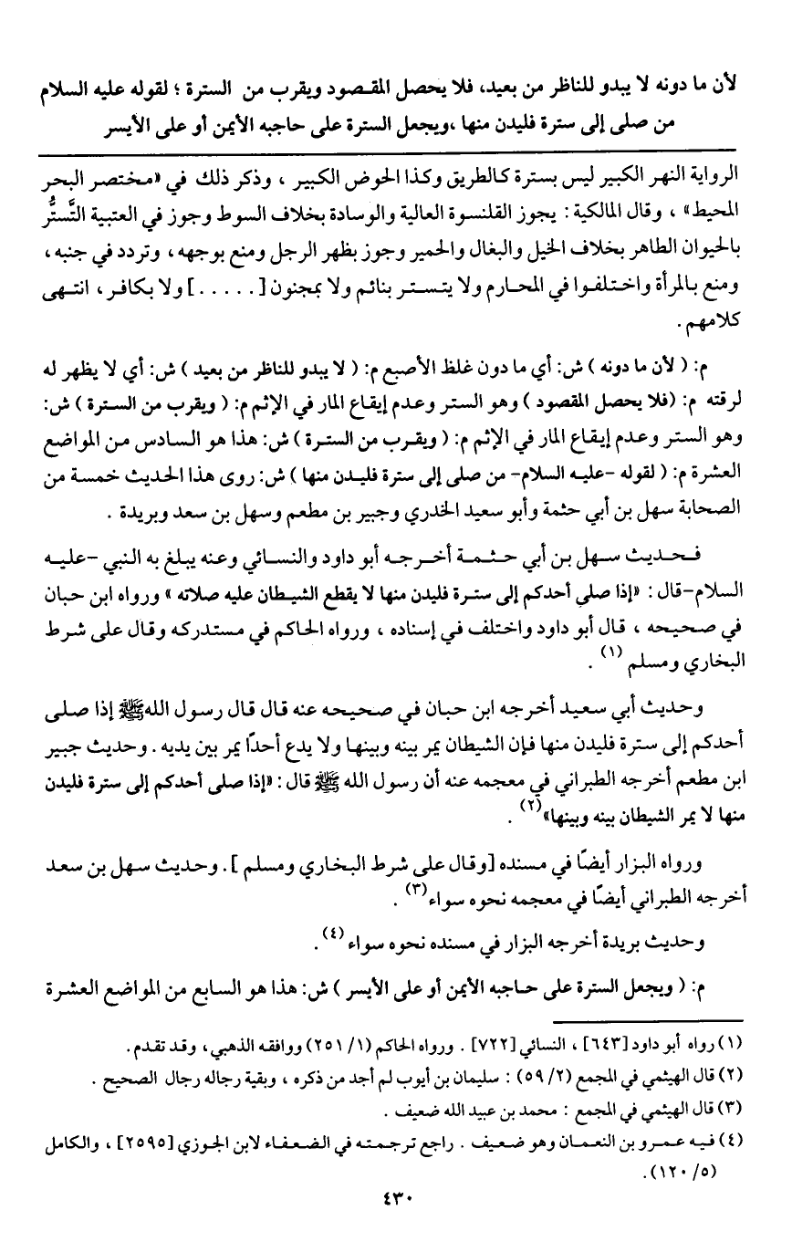 م: (لأن ما دونه) ش: أي ما دون غلظ الأصبع م: (لا يبدو للناظر من بعيد) ش: أي لا يظهر له لرقته م: (فلا يحصل المقصود) وهو الستر وعدم إيقاع المار في الإثم م: (ويقرب من السترة) ش: وهو الستر وعدم إيقاع المار في الإثم م: (ويقرب من السترة) ش: هذا هو السادس من المواضع العشرة م: (لقوله - عَلَيْهِ السَّلَامُ - «من صلى إلى سترة فليدن منها» ش: روى هذا الحديث خمسة من الصحابة: سهل بن أبي حثمة وأبو سعيد الخدري وجبير بن مطعم وسهل بن سعد وبريدة.