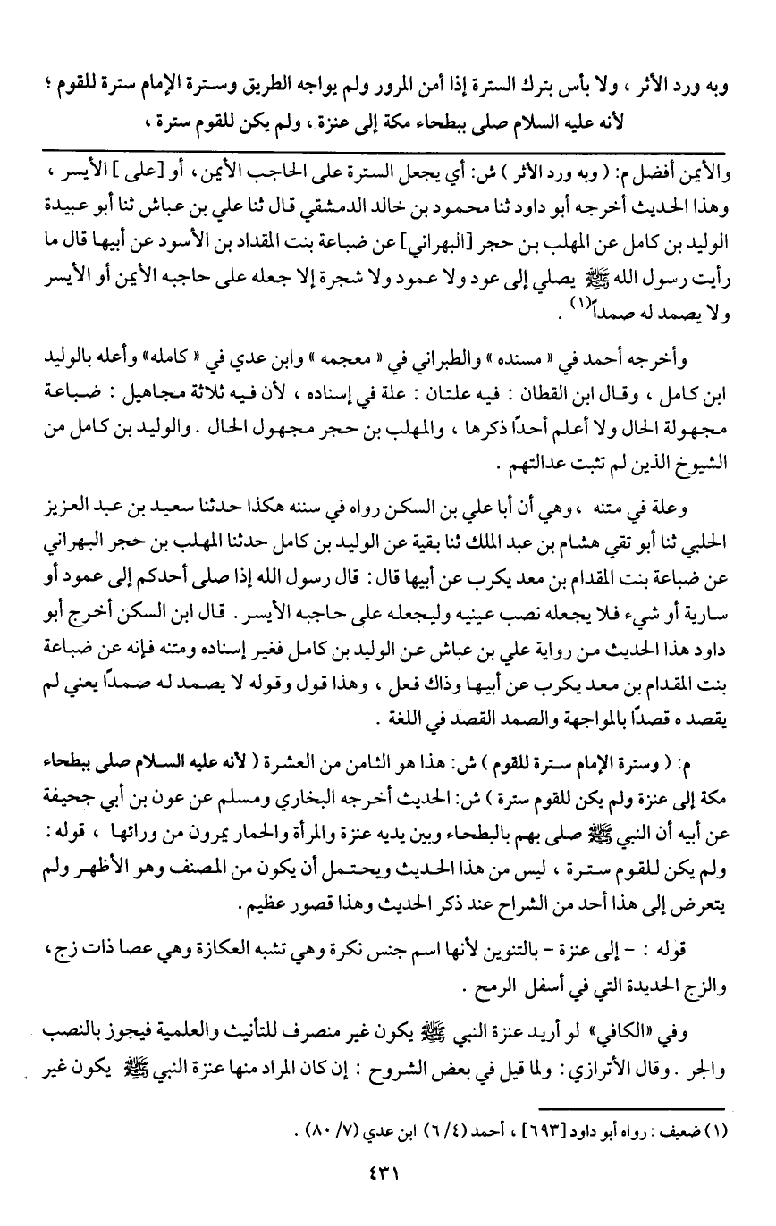 وعلة في متنه، وهي أن أبا علي بن السكن رواه في سننه هكذا: حدثنا سعيد بن عبد العزيز الحلبي، ثنا أبو تقي هشام بن عبد الملك، ثنا بقية، عن الوليد بن كامل، حدثنا المهلب بن حجر البهراني، عن ضباعة بنت المقدام بن معد يكرب، عن أبيها، قال: قال رسول الله: «إذا صلى أحدكم إلى عمود أو سارية أو شيء فلا يجعله نصب عينيه وليجعله على حاجبه الأيسر» . قال ابن السكن: أخرج أبو داود هذا الحديث من رواية علي بن عباش، عن الوليد بن كامل؛ فغير إسناده ومتنه، فإنه عن ضباعة بنت المقدام بن معد يكرب عن أبيها، وذاك فعل، وهذا قول، وقوله: لا يصمد له صمدا؛ يعني لم يقصده قصدا بالمواجهة، والصمد القصد في اللغة.