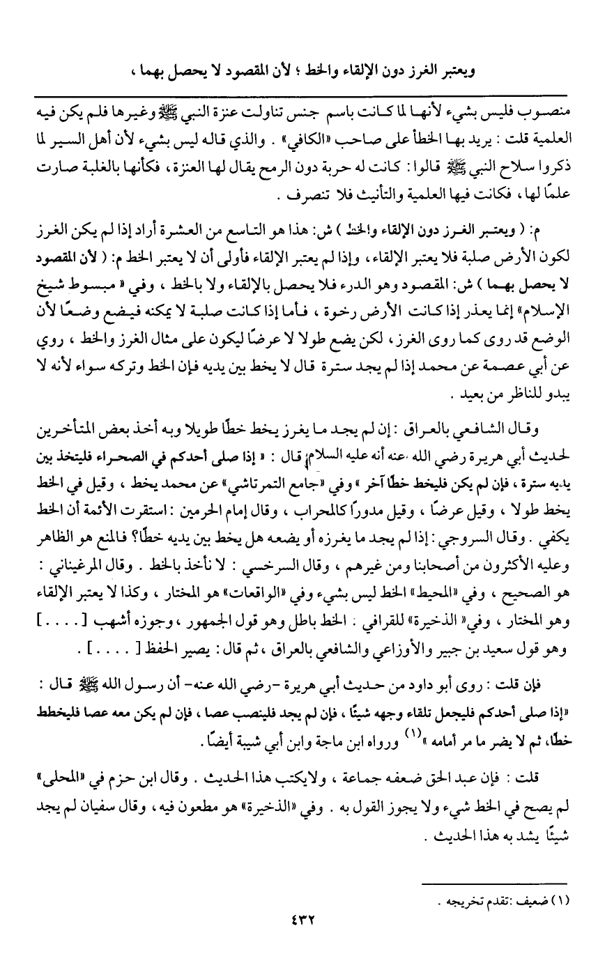 وقال الشافعي بالعراق: إن لم يجد ما يغرز يخط خطا طويلا وبه أخذ بعض المتأخرين لحديث أبي هريرة - رَضِيَ اللَّهُ عَنْهُ - أنه - عَلَيْهِ السَّلَامُ - قال: «إذا صلى أحدكم في الصحراء فليتخذ بين يديه سترة، فإن لم يكن فليخط خطا آخر» وفي " جامع التمرتاشي " عن محمد يخط، وقيل في الخط: يخط طولا، وقيل: عرضا، وقيل: مدورا كالمحراب، وقال إمام الحرمين: استقرت الأئمة أن الخط يكفي. وقال السروجي: إذا لم يجد ما يغرزه أو يضعه هل يخط بين يديه خطا؟ فالمنع هو الظاهر وعليه الأكثرون من أصحابنا ومن غيرهم، وقال السرخسي: لا نأخذ بالخط. وقال المرغيناني: هو الصحيح، وفي " المحيط " الخط ليس بشيء، وفي " الواقعات " هو المختار، وكذا لا يعتبر الإلقاء وهو المختار، وفي " الذخيرة " للقرافي: الخط باطل وهو قول الجمهور، وجوزه أشهب [ ... ] وهو قول سعيد بن جبير والأوزاعي والشافعي بالعراق، ثم قال: يصير الحفظ [