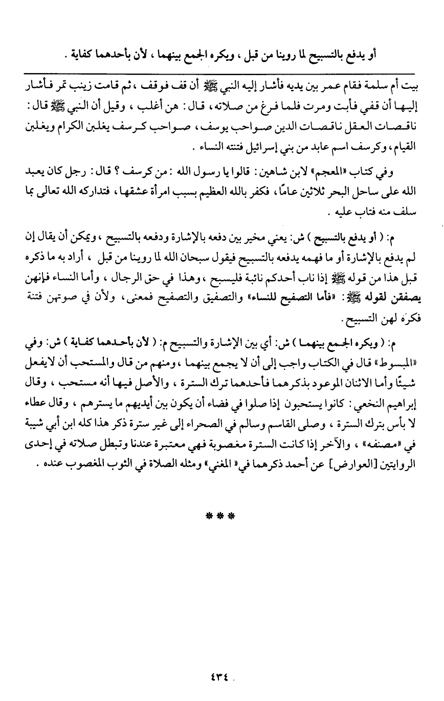أو يدفع بالتسبيح لما روينا من قبل، ويكره الجمع بينهما؛ لأن بأحدهما كفاية.