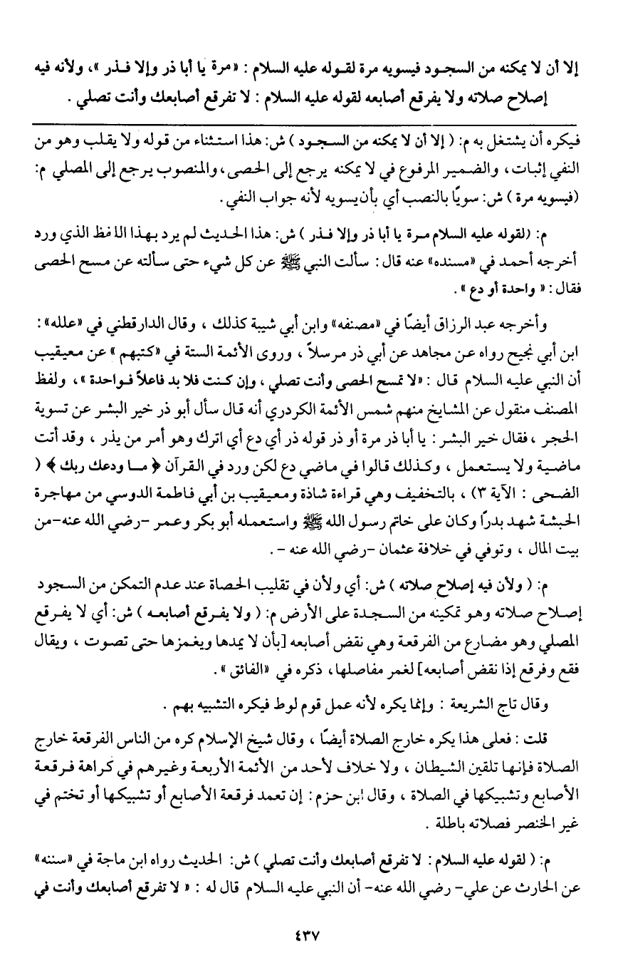 ـــــــــــــــــــــــــــــQفيكره أن يشتغل به م: (إلا أن لا يمكنه من السجود) ش: هذا استثناء من قوله: ولا يقلب وهو من النفي إثبات، والضمير المرفوع في لا يمكنه يرجع إلى الحصى، والمنصوب يرجع إلى المصلي م: (فيسويه مرة) ش: سويا بالنصب أي بأن يسويه لأنه جواب النفي.