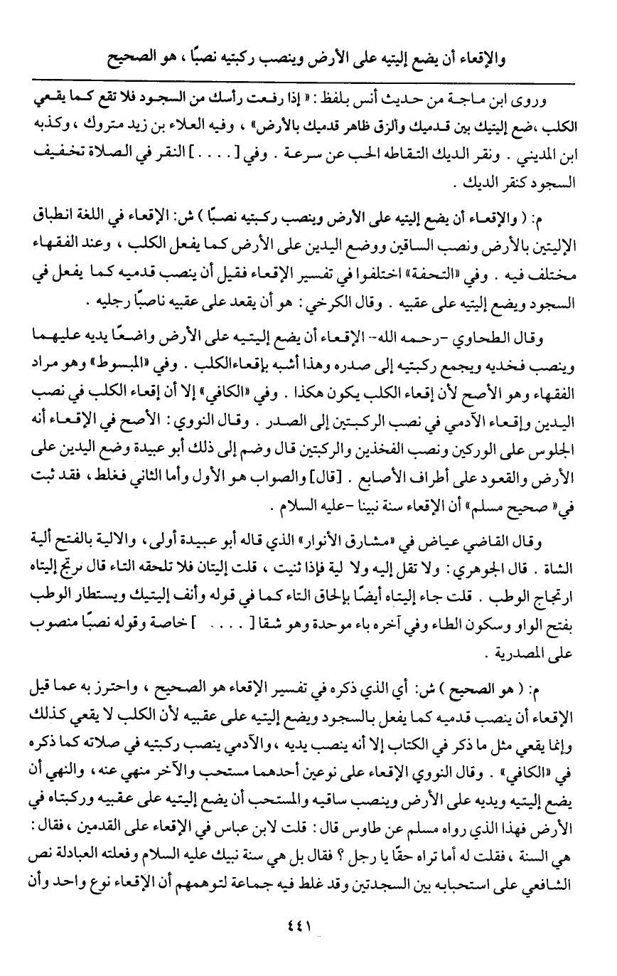 والإقعاء أن يضع إليتيه على الأرض وينصب ركبتيه نصبا، هو الصحيح