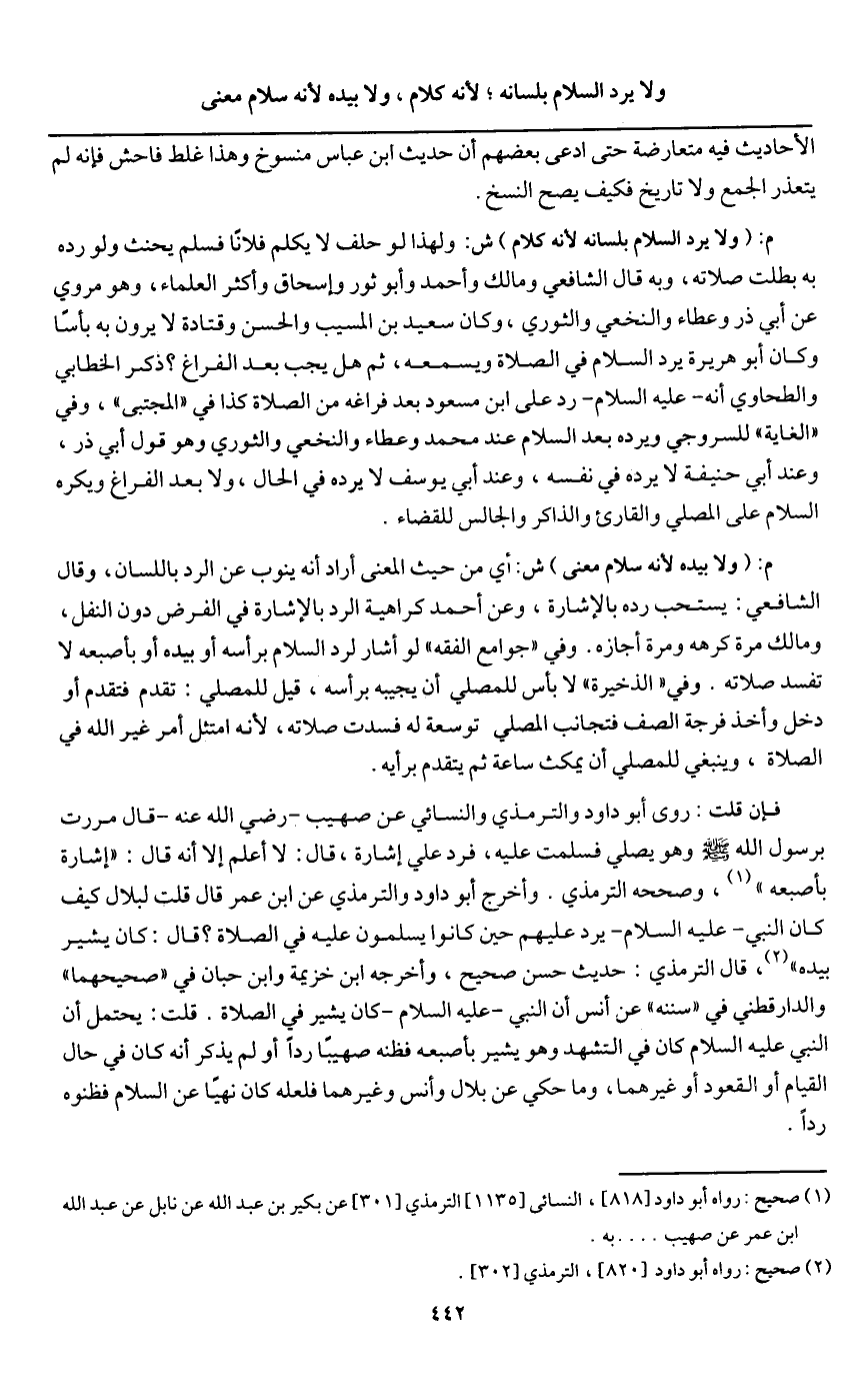 فإن قلت: روى أبو داود والترمذي والنسائي «عن صهيب - رَضِيَ اللَّهُ عَنْهُ - قال: مررت برسول الله - صَلَّى اللَّهُ عَلَيْهِ وَسَلَّمَ - وهو يصلي فسلمت عليه، فرد علي إشارة، قال: لا أعلم إلا أنه قال: " إشارة بأصبعه» ، وصححه الترمذي. وأخرج أبو داود والترمذي «عن ابن عمر قال: قلت لبلال: كيف كان النبي - عَلَيْهِ السَّلَامُ - يرد عليهم حين كانوا يسلمون عليه في الصلاة؟ قال: كان يشير بيده.» قال الترمذي: حديث حسن صحيح، وأخرجه ابن خزيمة وابن حبان في " صحيحهما " والدارقطني في " سننه " عن أنس «أن النبي - عَلَيْهِ السَّلَامُ - كان يشير في الصلاة» . قلت: يحتمل أن النبي - عَلَيْهِ السَّلَامُ - كان في التشهد وهو يشير بأصبعه فظنه صهيبا ردا أو لم يذكر أنه كان في حال القيام أو القعود أو غيرهما، وما حكي عن بلال وأنس وغيرهما فلعله كان نهيا عن السلام فظنوه ردا.