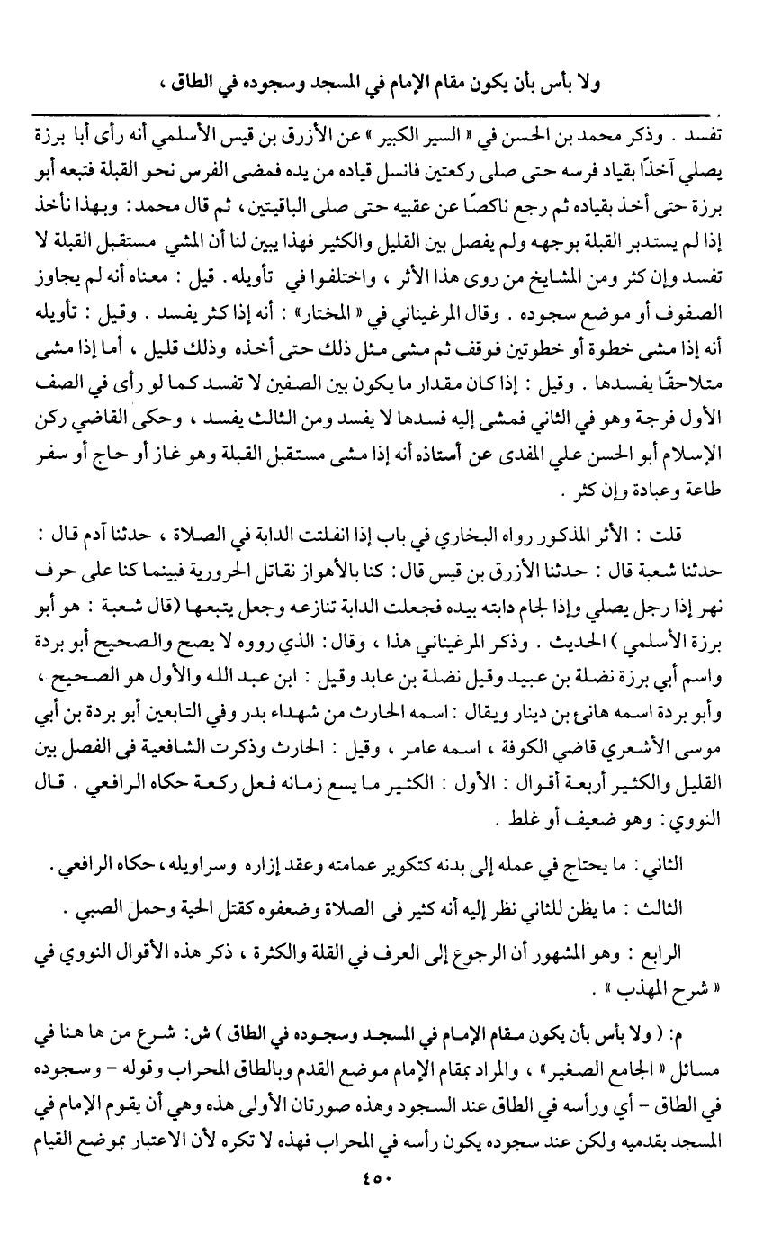 قلت: الأثر المذكور رواه البخاري في باب إذا انفلتت الدابة في الصلاة، حدثنا آدم قال: حدثنا شعبة قال: حدثنا الأزرق بن قيس قال: كنا بالأهواز نقاتل الحرورية، فبينما كنا على حرف نهر إذا رجل يصلي وإذا لجام دابته بيده، فجعلت الدابة تنازعه وجعل يتبعها، (قال شعبة: هو أبو برزة الأسلمي) الحديث. وذكر المرغيناني هذا، وقال: الذي رووه لا يصح، والصحيح أبو بردة، واسم أبي برزة نضلة بن عبيد وقيل نضلة بن عابد وقيل: ابن عبد الله والأول هو الصحيح، وأبو بردة اسمه هانئ بن دينار، ويقال: اسمه الحارث من شهداء بدر، وفي التابعين أبو بردة بن أبي موسى الأشعري قاضي الكوفة، اسمه عامر، وقيل الحارث، وذكرت الشافعية في الفصل بين القليل والكثير أربعة أقوال: الأول: الكثير ما يسع زمانه فعل ركعة حكاه الرافعي. قال النووي: وهو ضعيف أو غلط.