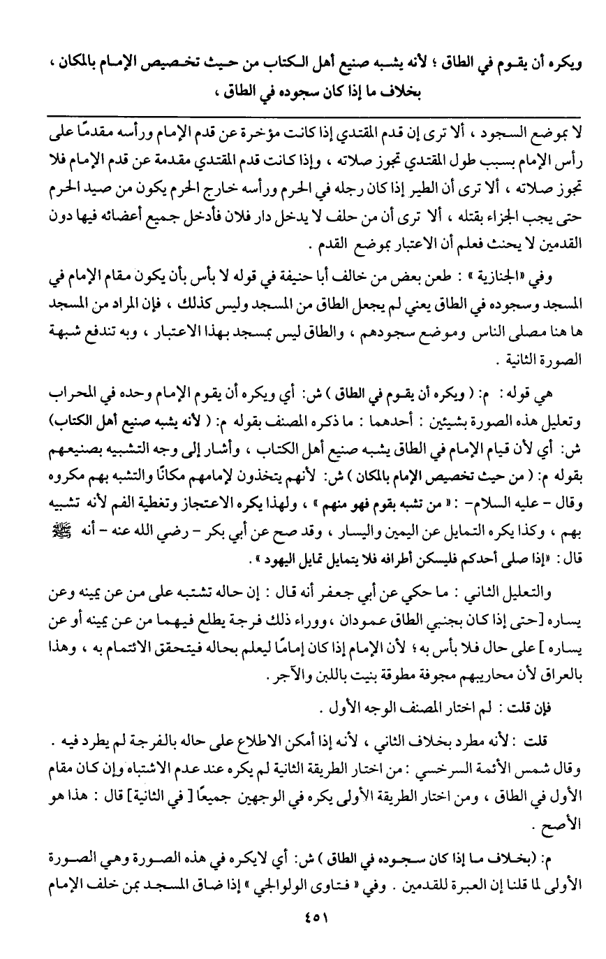وفي " الجنازية ": طعن بعض من خالف أبا حنيفة في قوله لا بأس بأن يكون مقام الإمام في المسجد وسجوده في الطاق يعني لم يجعل الطاق من المسجد وليس كذلك، فإن المراد من المسجد هاهنا مصلى الناس وموضع سجودهم، والطاق ليس بمسجد بهذا الاعتبار، وبه تندفع شبهة الصورة الثانية.
