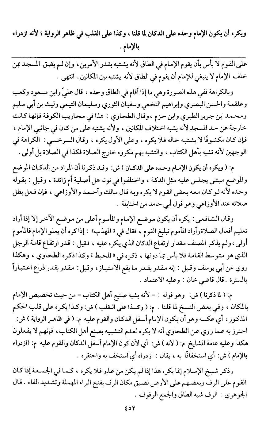 وبالكراهة ففي هذه الصورة وهي ما إذا أقام في الطاق وحده، قال علي وابن مسعود وكعب وعلقمة والحسن البصري وإبراهيم النخعي وسفيان الثوري وسليمان التيمي وليث بن أبي سليم ومحمد بن جرير الطبري وابن حزم، وقال الطحاوي: هذا في محاريب الكوفة فإنها كانت خارجة عن حد المسجد؛ لأنه يشبه اختلاف المكانين، ولأنه يشتبه على من كان في جانبي الإمام، فإن كان مكشوفا لا يشتبه حاله فلا يكره، وعلى الأول يكره، وقال السرخسي: الكراهة في الوجهين؛ لأنه تشبه بأهل الكتاب، والتشبه بهم مكروه خارج الصلاة فكذا في الصلاة بل أولي.