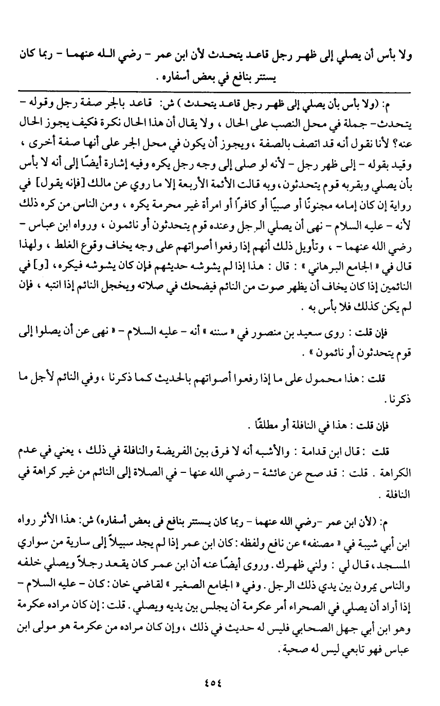 ولا بأس أن يصلي إلى ظهر رجل قاعد يتحدث؛ لأن ابن عمر - رَضِيَ اللَّهُ عَنْهُمَا - ربما كان يستتر بنافع في بعض أسفاره.