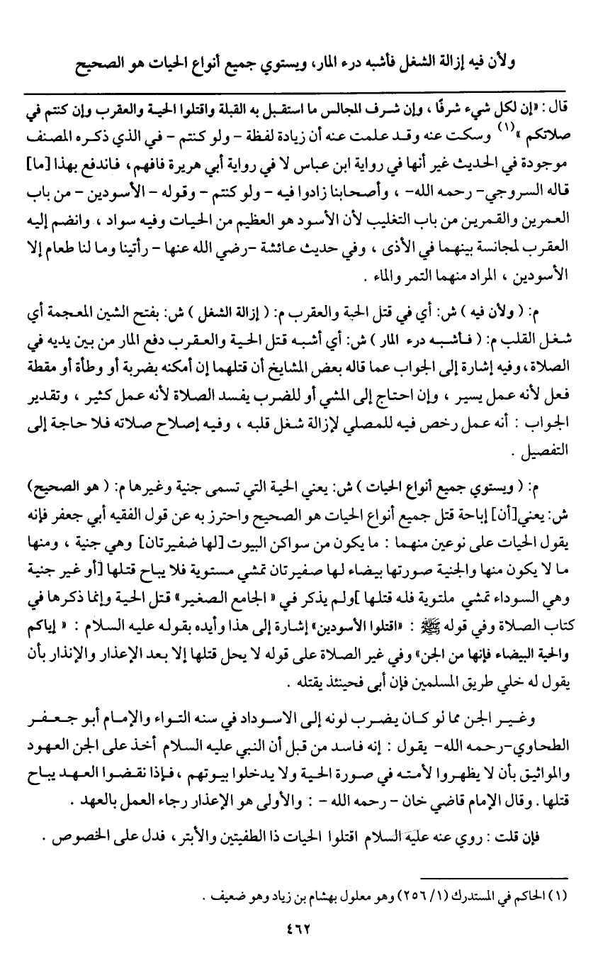 وغير الجن مما لو كان يضرب لونه إلى الاسوداد في سنه التواء، والإمام أبو جعفر الطحاوي - رَحِمَهُ اللَّهُ - يقول: إنه فاسد من قبل أن النبي - عَلَيْهِ السَّلَامُ - أخذ على الجن العهود والمواثيق بأن لا يظهروا لأمته في صورة الحية ولا يدخلوا بيوتهم، فإذا نقضوا العهد يباح قتلها. وقال الإمام قاضي خان - رَحِمَهُ اللَّهُ -: والأولى هو الإعذار رجاء العمل بالعهد.