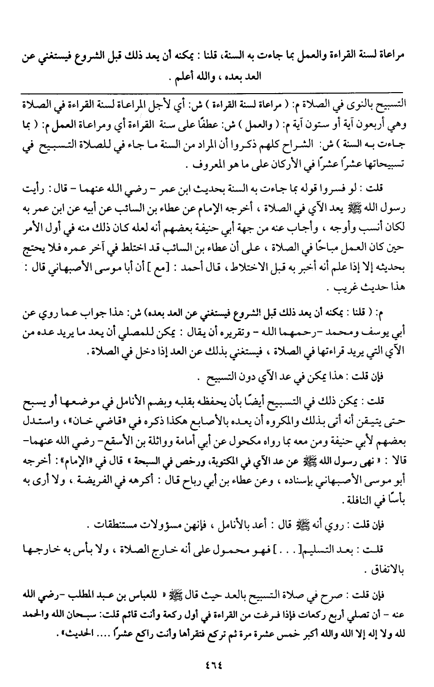 فإن قلت: صرح في صلاة التسبيح بالعد حيث «قال - صَلَّى اللَّهُ عَلَيْهِ وَسَلَّمَ - " للعباس بن عبد المطلب - رَضِيَ اللَّهُ عَنْهُمْ - أن تصلي أربع ركعات فإذا فرغت من القراءة في أول ركعة وأنت قائم قلت: سبحان الله والحمد لله ولا إله إلا الله والله أكبر خمس عشرة مرة، ثم تركع فتقرأها وأنت راكع عشرا ... » الحديث.