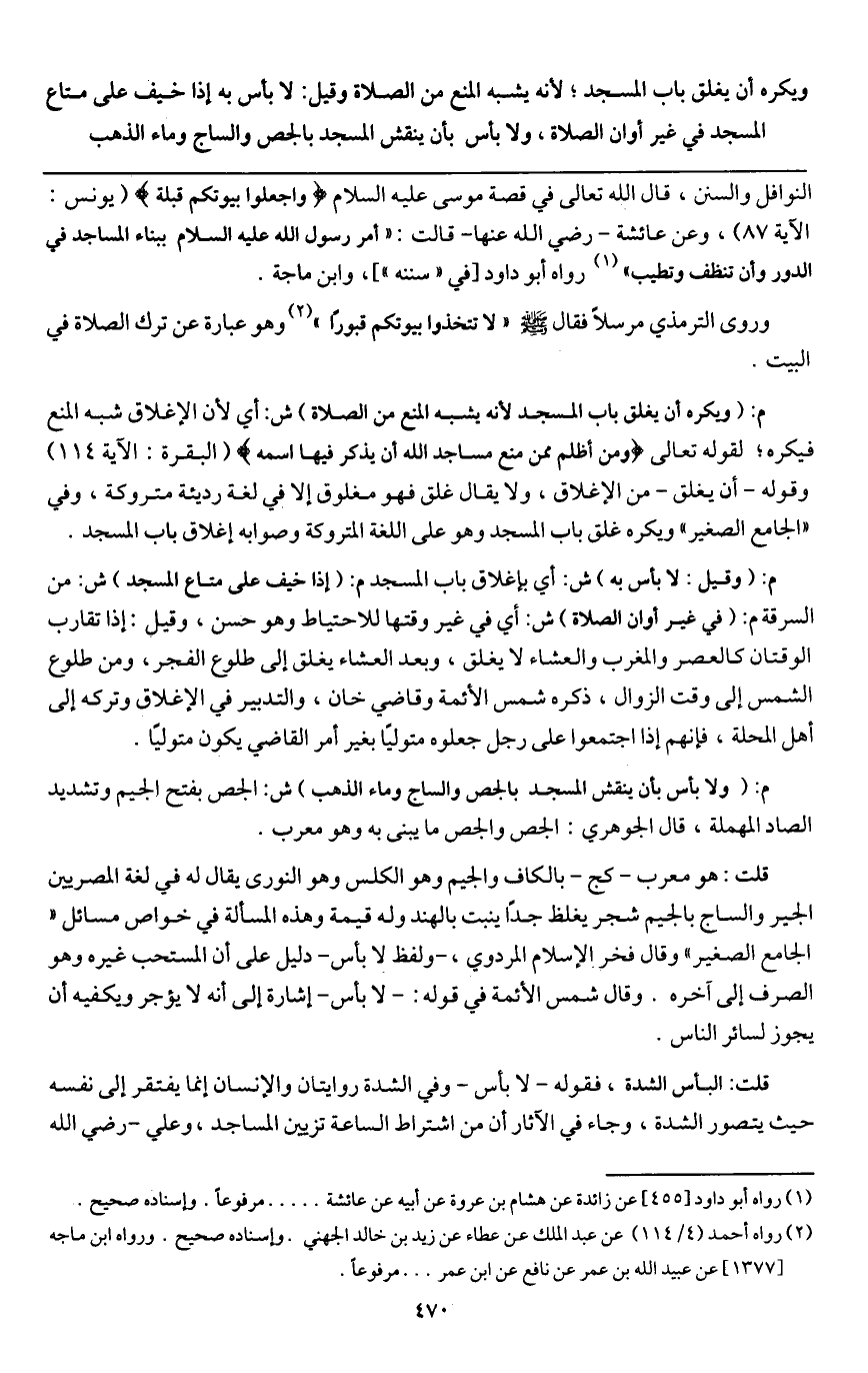 ويكره أن يغلق باب المسجد؛ لأنه يشبه المنع من الصلاة، وقيل: لا بأس به إذا خيف على متاع المسجد في غير أوان الصلاة، ولا بأس بأن ينقش المسجد بالجص والساج وماء الذهب.