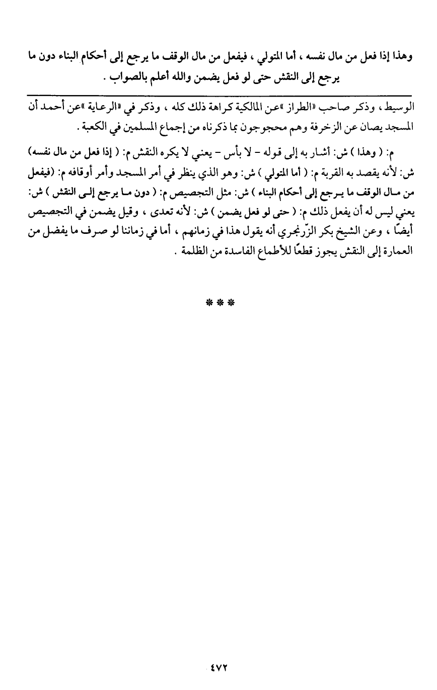 ـــــــــــــــــــــــــــــQالوسيط، وذكر صاحب " الطراز " عن المالكية كراهة ذلك كله، وذكر في " الرعاية " عن أحمد أن المسجد يصان عن الزخرفة وهم محجوجون بما ذكرناه من إجماع المسلمين في الكعبة.