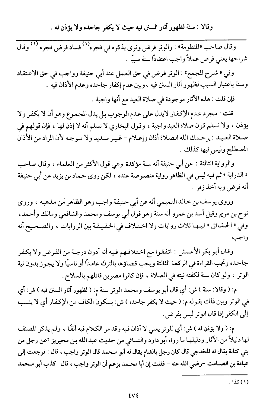 م: (وقالا: سنة) ش: أي قال أبو يوسف ومحمد: الوتر سنة م: (لظهور آثار السنن فيه) ش: أي في الوتر وبين ذلك بقوله م: (حيث لا يكفر جاحده) ش: بسكون الكاف من الإكفار أي لا ينسب إلى الكفر إذا قال الوتر ليس بفرض.