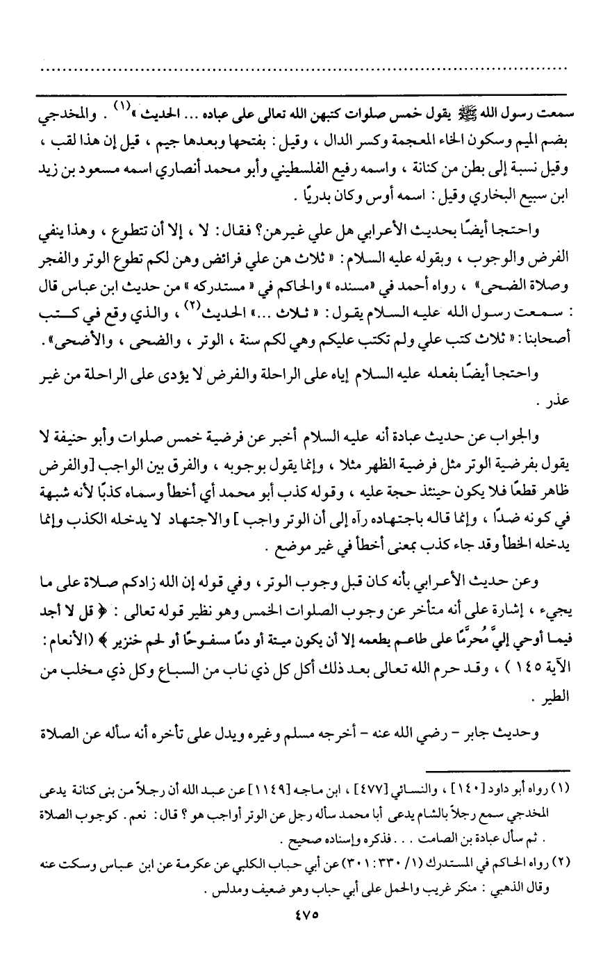 وعن حديث الأعرابي بأنه كان قبل وجوب الوتر، وفي قوله إن الله زادكم صلاة على ما يجيء، إشارة على أنه متأخر عن وجوب الصلوات الخمس، وهو نظير قَوْله تَعَالَى: {قُلْ لَا أَجِدُ فِي مَا أُوحِيَ إِلَيَّ مُحَرَّمًا عَلَى طَاعِمٍ يَطْعَمُهُ إِلَّا أَنْ يَكُونَ مَيْتَةً أَوْ دَمًا مَسْفُوحًا أَوْ لَحْمَ خِنْزِيرٍ} [الأنعام: 145] (الأنعام: الآية 145) ، وقد حرم الله تعالى بعد ذلك أكل كل ذي ناب من السباع، وكل ذي مخلب من الطير.