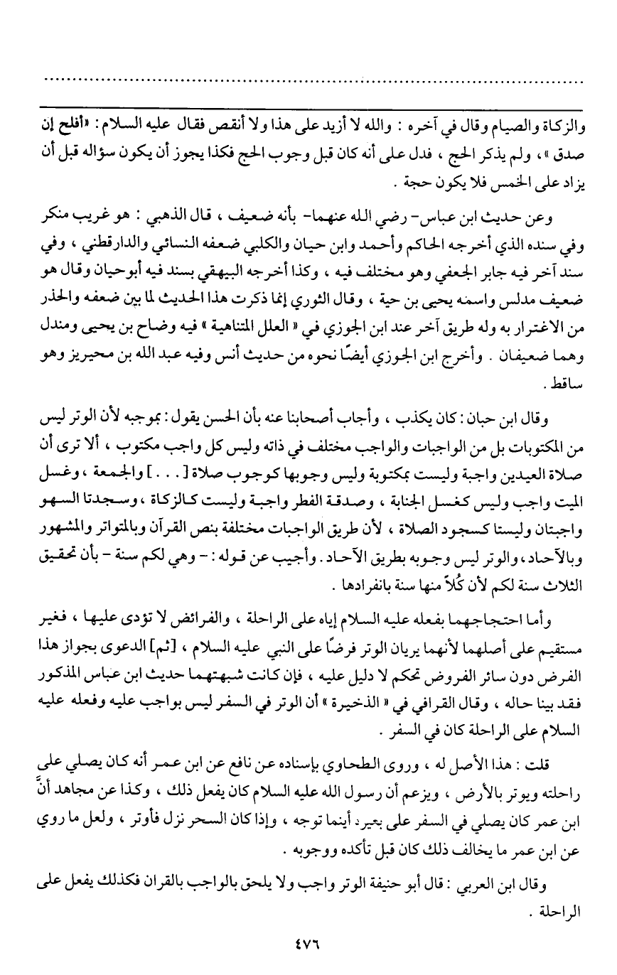 وقال ابن حبان: كان يكذب، وأجاب أصحابنا عنه بأن الحسن يقول: بموجبه لأن الوتر ليس من المكتوبات بل من الواجبات، والواجب مختلف في ذاته وليس كل واجب مكتوب، ألا ترى أن صلاة العيدين واجبة وليست بمكتوبة وليس وجوبها كوجوب صلاة [......] والجمعة، وغسل الميت واجب وليس كغسل الجنابة، وصدقة الفطر واجبة وليست كالزكاة، وسجدتا السهو واجبتان وليستا كسجود الصلاة؛ لأن طريق الواجبات مختلفة بنص القرآن وبالمتواتر والمشهور وبالآحاد، والوتر ليس وجوبه بطريق الآحاد. وأجيب عن قوله: وهي لكم سنة بأن تحقيق الثلاث سنة لكم؛ لأن كلا منها سنة بانفرادها.