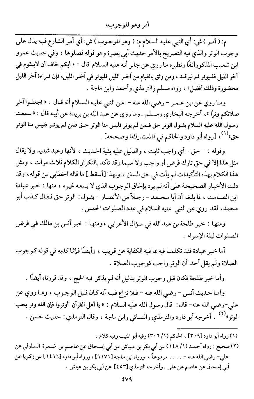 وما روي عن ابن عمر - رَضِيَ اللَّهُ عَنْهُ - عن النبي - عَلَيْهِ السَّلَامُ - أنه قال: «اجعلوا آخر صلاتكم وترا» ، أخرجه البخاري ومسلم. وما روي عن عبد الله بن بريدة عن أبيه قال: سمعت رسول الله - عَلَيْهِ السَّلَامُ - يقول: «الوتر حق فمن لم يوتر فليس منا، الوتر حق فمن لم يوتر فليس منا، الوتر حق» ، [رواه أبو داود والحاكم في " المستدرك " وصححه] .