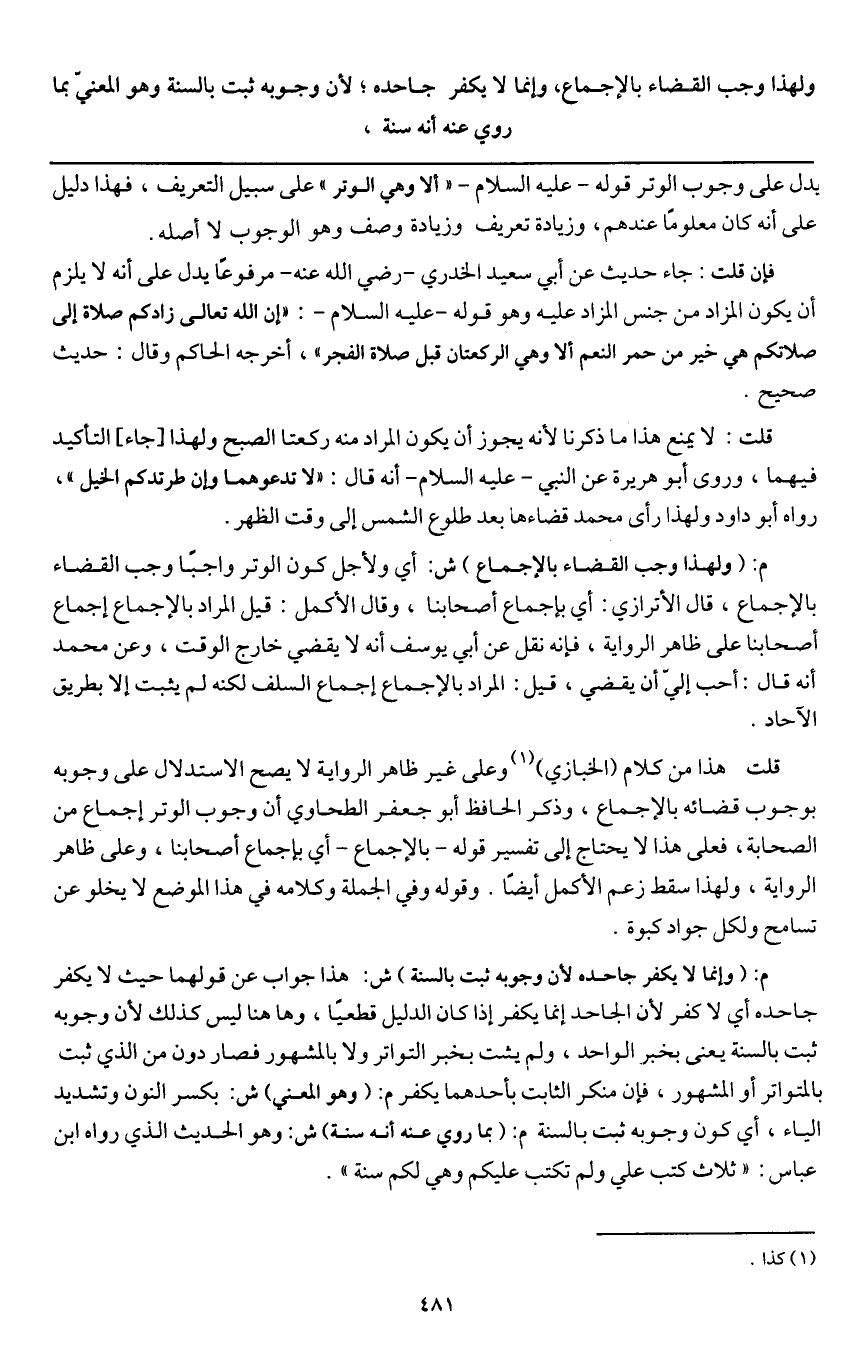 قلت: هذا من كلام (الخبازي) وعلى غير ظاهر الرواية لا يصح الاستدلال على وجوبه بوجوب قضائه بالإجماع، وذكر الحافظ أبو جعفر الطحاوي أن وجوب الوتر إجماع من الصحابة، فعلى هذا لا يحتاج إلى تفسير قوله بالإجماع أي بإجماع أصحابنا، وعلى ظاهر الرواية، ولهذا سقط زعم الأكمل أيضا. وقوله وفي الجملة وكلامه في هذا الموضع لا يخلو عن تسامح ولكل جواد كبوة.