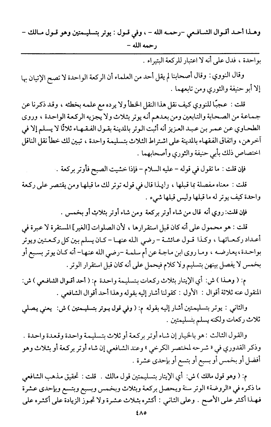 قلت: عجبا للنووي كيف نقل هذا النقل الخطأ ولا يرده مع علمه بخطئه، وقد ذكرنا عن جماعة من الصحابة والتابعين ومن بعدهم أنه يوتر بثلاث ولا يجزيه الركعة الواحدة، وروى الطحاوي عن عمر بن عبد العزيز أنه أثبت الوتر بالمدينة بقول الفقهاء ثلاثا لا يسلم إلا في آخرهن، واتفق الفقهاء بالمدينة على اشتراط الثلاث بتسلمية واحدة، تبين لك خطأ نقل الناقل اختصاص ذلك بأبي حنيفة والثوري وأصحابهما.