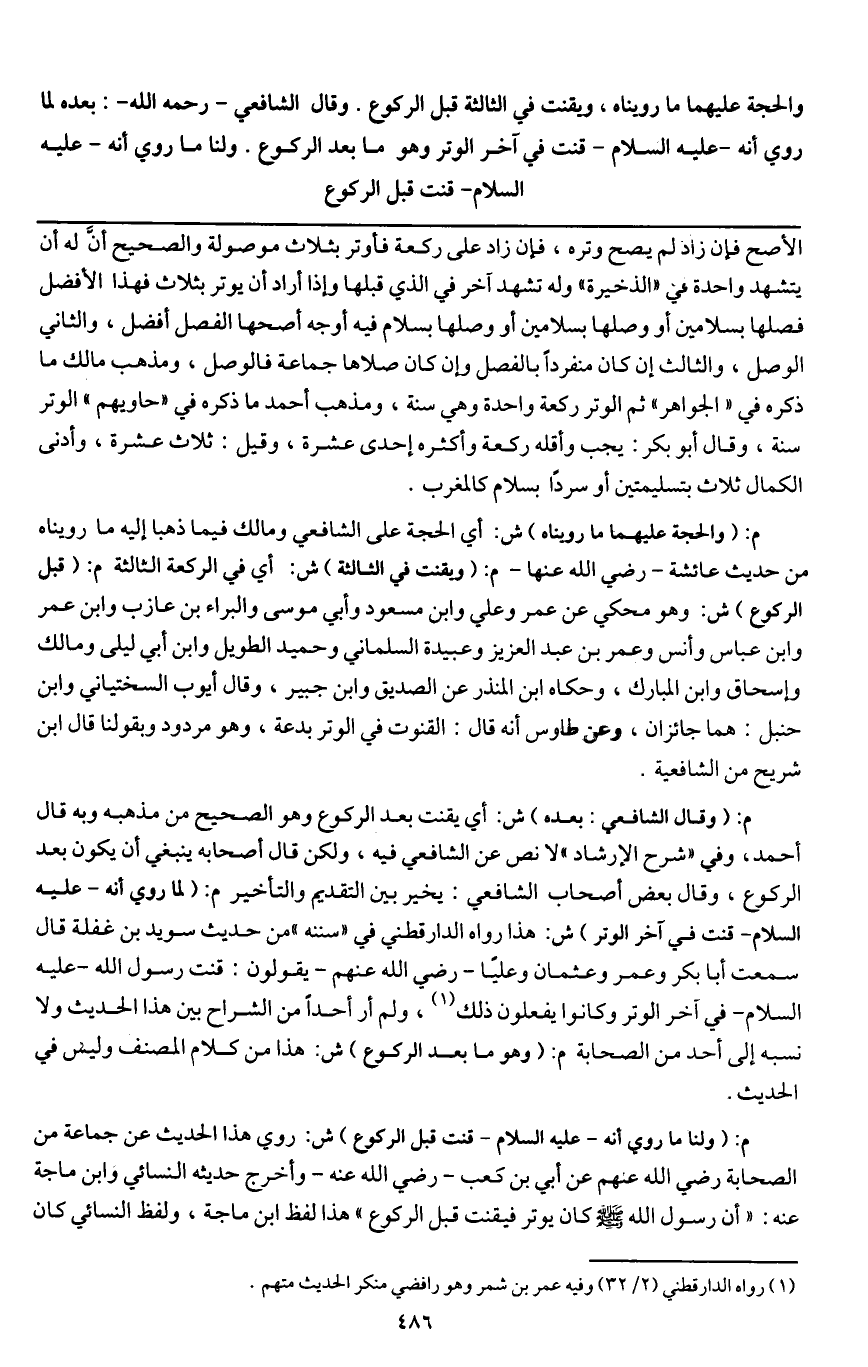 م: (والحجة عليهما ما رويناه) ش: أي الحجة على الشافعي ومالك فيما ذهبا إليه ما رويناه من حديث عائشة - رَضِيَ اللَّهُ عَنْهَا - م: (ويقنت في الثالثة) ش: أي في الركعة الثالثة م: (قبل الركوع) ش: وهو محكي عن عمر وعلي وابن مسعود وأبي موسى والبراء بن عازب وابن عمر وابن عباس وأنس وعمر بن عبد العزيز وعبيدة السلماني وحميد الطويل وابن أبي ليلى ومالك وإسحاق وابن المبارك، وحكاه ابن المنذر عن الصديق وابن جبير، وقال أيوب السختياني وابن حنبل: هما جائزان، وعن طاوس أنه قال: القنوت في الوتر بدعة، وهو مردود، وبقولنا قال ابن شريح من الشافعية.