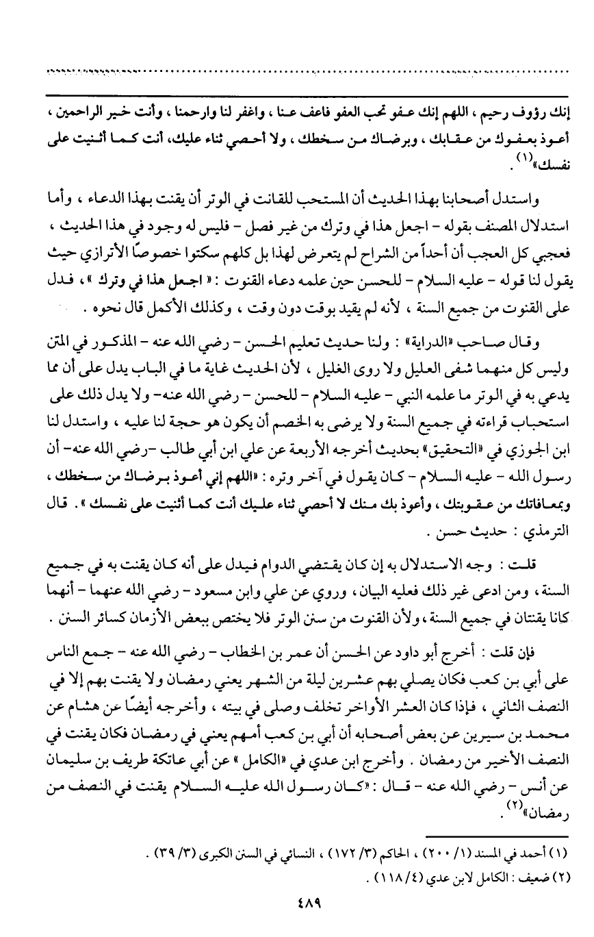 وقال صاحب " الدراية ": ولنا حديث تعليم الحسن - رَضِيَ اللَّهُ عَنْهُ - المذكور في المتن وليس كل منهما شفى العليل ولا روى الغليل؛ لأن الحديث غاية ما في الباب يدل على أن مما يدعى به في الوتر ما علمه النبي - عَلَيْهِ السَّلَامُ - للحسن - رَضِيَ اللَّهُ عَنْهُ - ولا يدل ذلك على استحباب قراءته في جميع السنة ولا يرضى به الخصم أن يكون هو حجة لنا عليه، واستدل لنا ابن الجوزي في " التحقيق " بحديث أخرجه الأربعة عن علي ابن أبي طالب - رَضِيَ اللَّهُ عَنْهُ - «أن رسول الله - عَلَيْهِ السَّلَامُ - كان يقول في آخر وتره: " اللهم أني أعوذ برضاك من سخطك، وبمعافاتك من عقوبتك، وأعوذ بك منك لا أحصي ثناء عليك أنت كما أثنيت على نفسك.» قال الترمذي: حديث حسن.