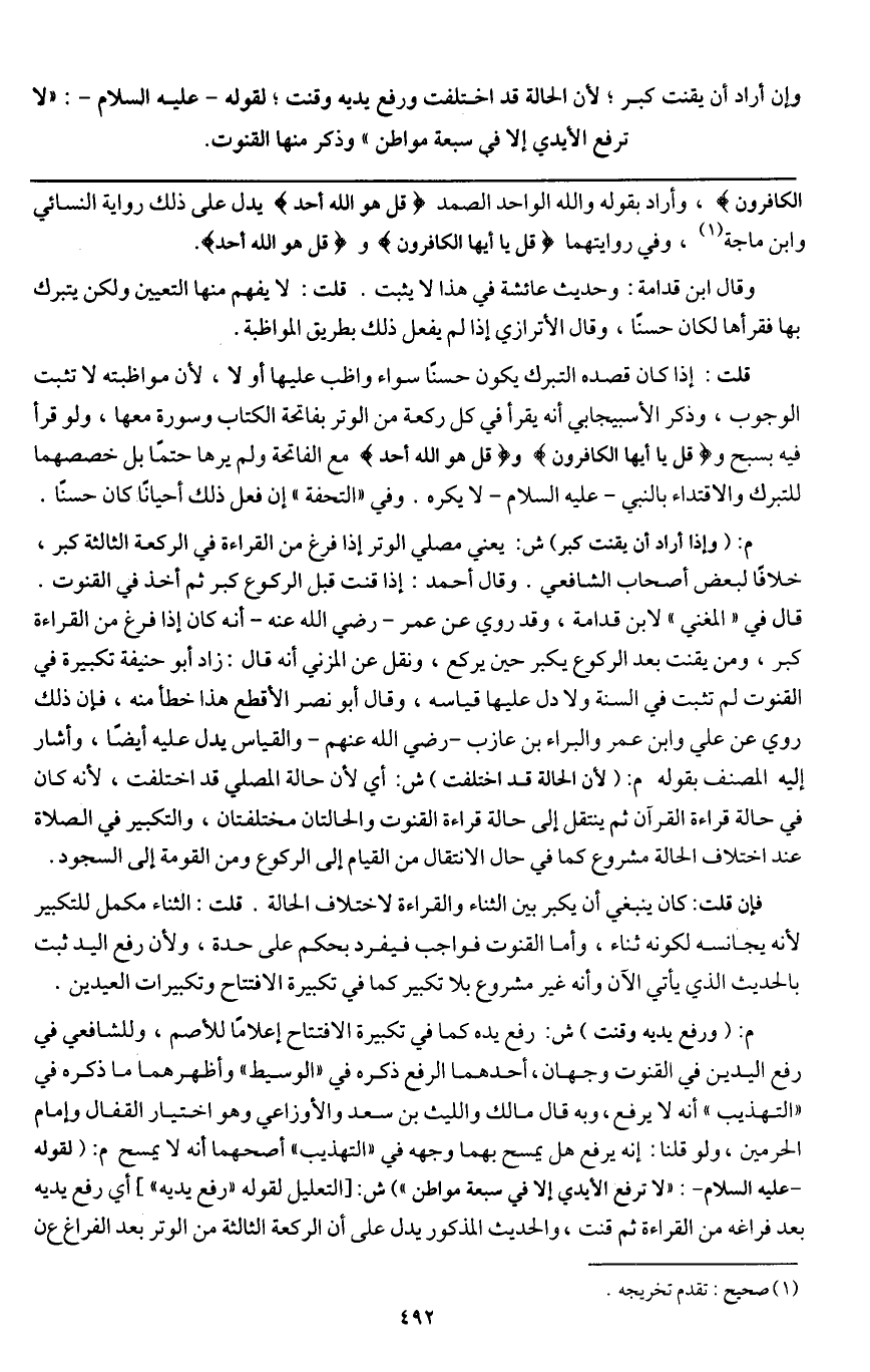 وإن أراد أن يقنت كبر؛ لأن الحالة قد اختلفت ورفع يديه وقنت؛ لقوله - عَلَيْهِ السَّلَامُ -: «لا ترفع الأيدي إلا في سبعة مواطن» وذكر منها القنوت: