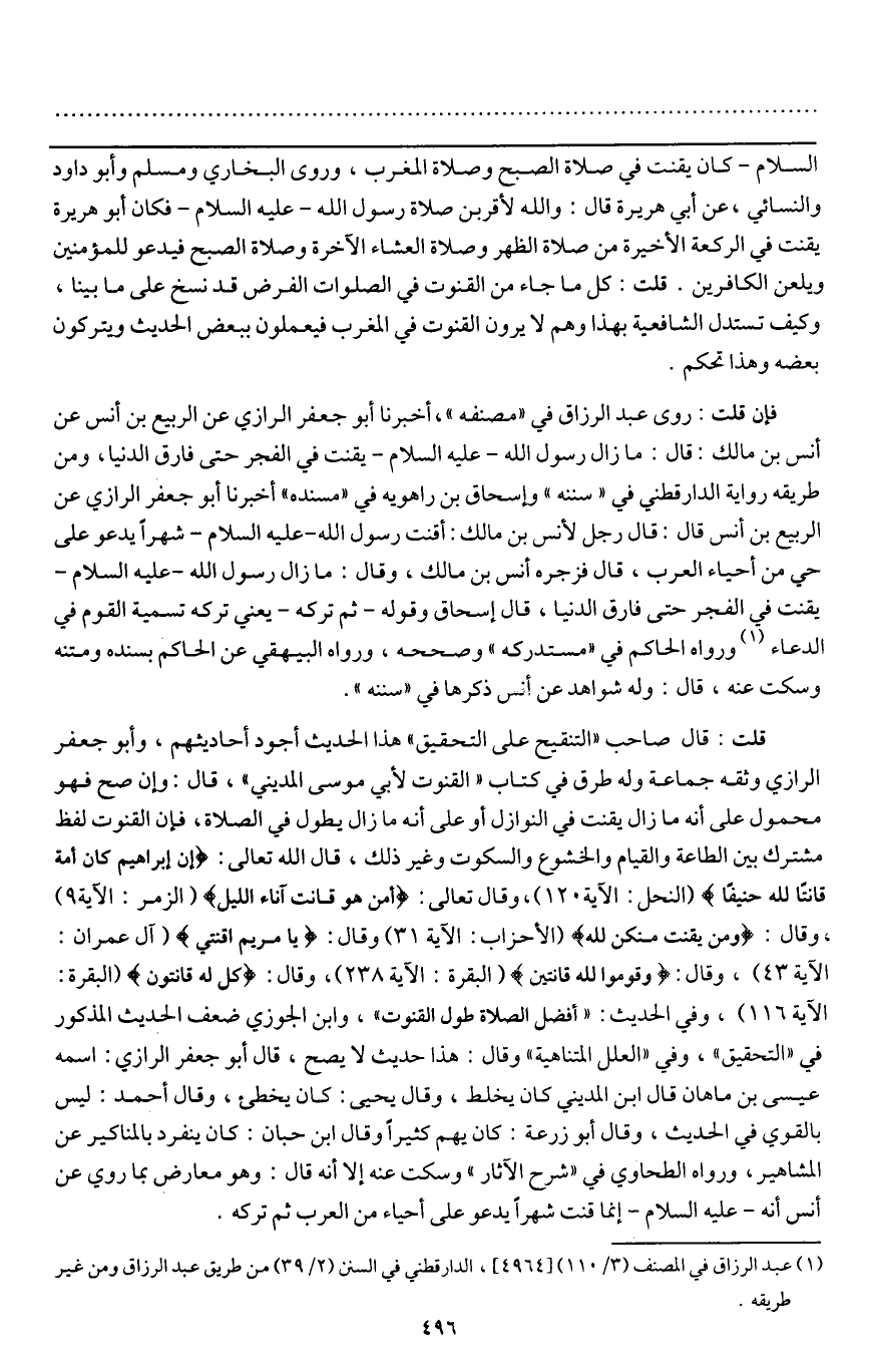 فإن قلت: روى عبد الرزاق في " مصنفه "، أخبرنا أبو جعفر الرازي عن الربيع بن أنس عن أنس بن مالك: قال «مازال رسول الله - عَلَيْهِ السَّلَامُ - يقنت في الفجر حتى فارق الدنيا» ومن طريقه رواية الدارقطني في " سننه " وإسحاق بن راهويه في " مسنده " أخبرنا أبو جعفر الرازي عن الربيع بن أنس قال: «قال رجل لأنس بن مالك: أقنت رسول الله - عَلَيْهِ السَّلَامُ - شهرا يدعو على حي من أحياء العرب، قال فزجره أنس بن مالك، وقال: مازال رسول الله - عَلَيْهِ السَّلَامُ - يقنت في الفجر حتى فارق الدنيا» قال إسحاق وقوله ثم تركه يعني تركه تسمية القوم في الدعاء، ورواه الحاكم في " مستدركه " وصححه، ورواه البيهقي عن الحاكم بسنده ومتنه وسكت عنه، قال: وله شواهد عن أنس ذكرها في " سننه ".