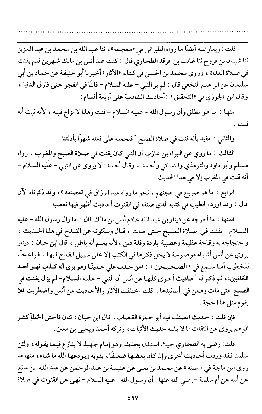 ـــــــــــــــــــــــــــــQقلت: ويعارضه أيضا ما رواه الطبراني في " معجمه "، ثنا عبد الله بن محمد بن عبد العزيز ثنا شيبان بن فروخ ثنا غالب بن فرقد الطحاوي قال: كنت عند أنس بن مالك شهرين فلم يقنت في صلاة الغداة، وروى محمد بن الحسن في كتابه " الآثار " أخبرنا أبو حنيفة عن حماد بن أبي سليمان عن إبراهيم النخعي قال: «لم ير النبي - عَلَيْهِ السَّلَامُ - قانتا في الفجر حتى فارق الدنيا» وقال ابن الجوزي في " التحقيق ": أحاديث الشافعية على أربعة أقسام: