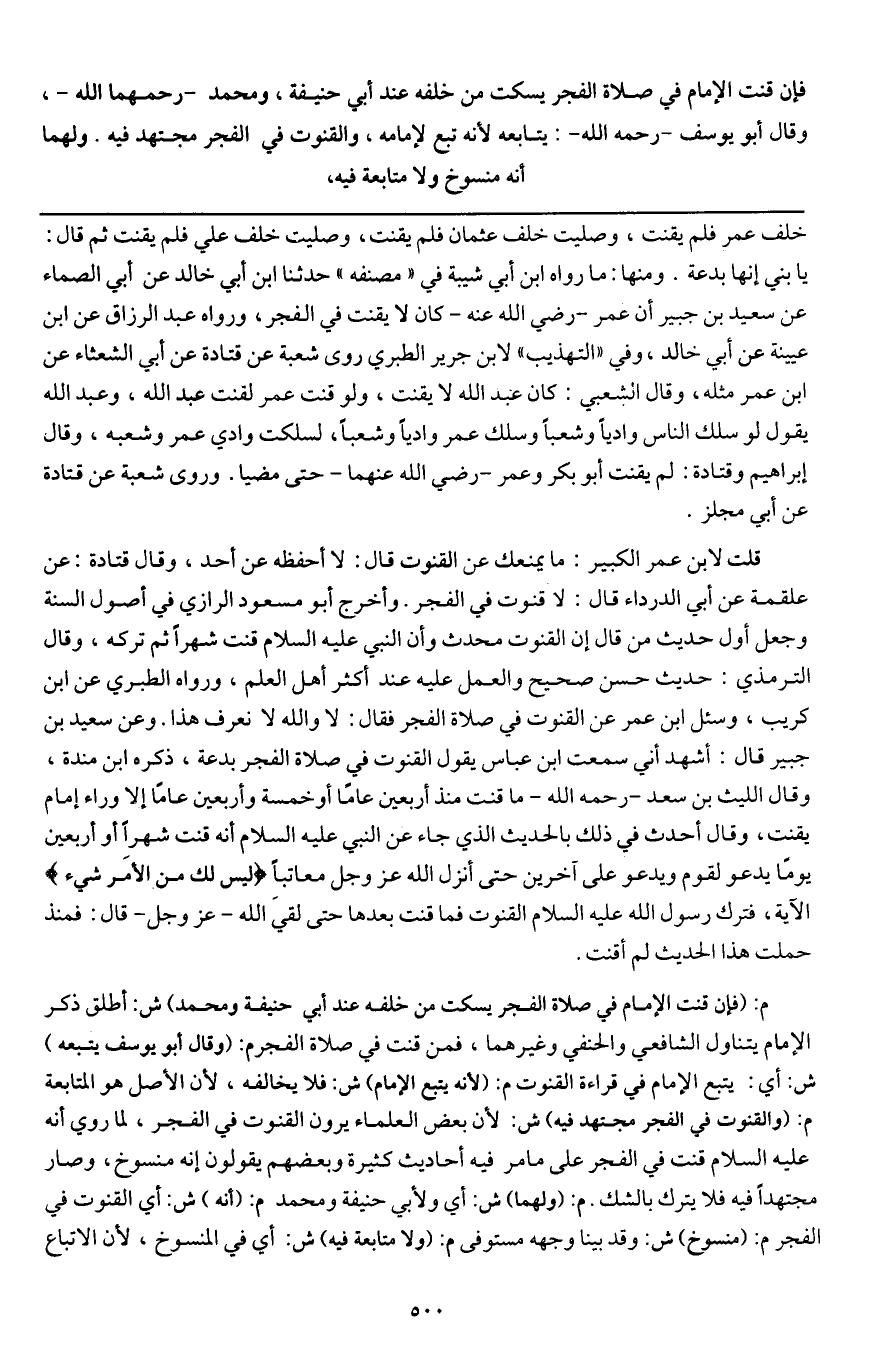 قلت: لابن عمر الكبير: ما يمنعك عن القنوت قال: لا أحفظه عن أحد، وقال قتادة: عن علقمة عن أبي الدرداء قال: لا قنوت في الفجر، وأخرج أبو مسعود الرازي في أصول السنة وجعل أول حديث من قال إن القنوت محدث وأن النبي - عَلَيْهِ السَّلَامُ - قنت شهرا ثم تركه، وقال الترمذي: حديث حسن صحيح والعمل عليه عند أكثر أهل العلم، ورواه الطبري عن ابن كريب، وسئل ابن عمر عن القنوت في صلاة الفجر فقال: لا والله لا نعرف هذا. وعن سعيد بن جبير قال: أشهد أني سمعت ابن عباس يقول: القنوت في صلاة الفجر بدعة، ذكره ابن منده، وقال الليث بن سعد - رَحِمَهُ اللَّهُ -: ما قنت منذ أربعين عاما أو خمسة وأربعين عاما إلا وراء إمام يقنت، وقال: أحدث في ذلك بالحديث الذي جاء عن النبي - عَلَيْهِ السَّلَامُ - أنه قنت شهرا أو أربعين يوما يدعو لقوم ويدعو على آخرين حتى أنزل الله عز وجل معاتبا {لَيْسَ لَكَ مِنَ الْأَمْرِ شَيْءٌ} [آل عمران: 128] الآية، فترك رسول الله - عَلَيْهِ السَّلَامُ - القنوت فما قنت بعدها حتى لقي الله عز وجل قال: فمنذ حملت هذا الحديث لم أقنت.