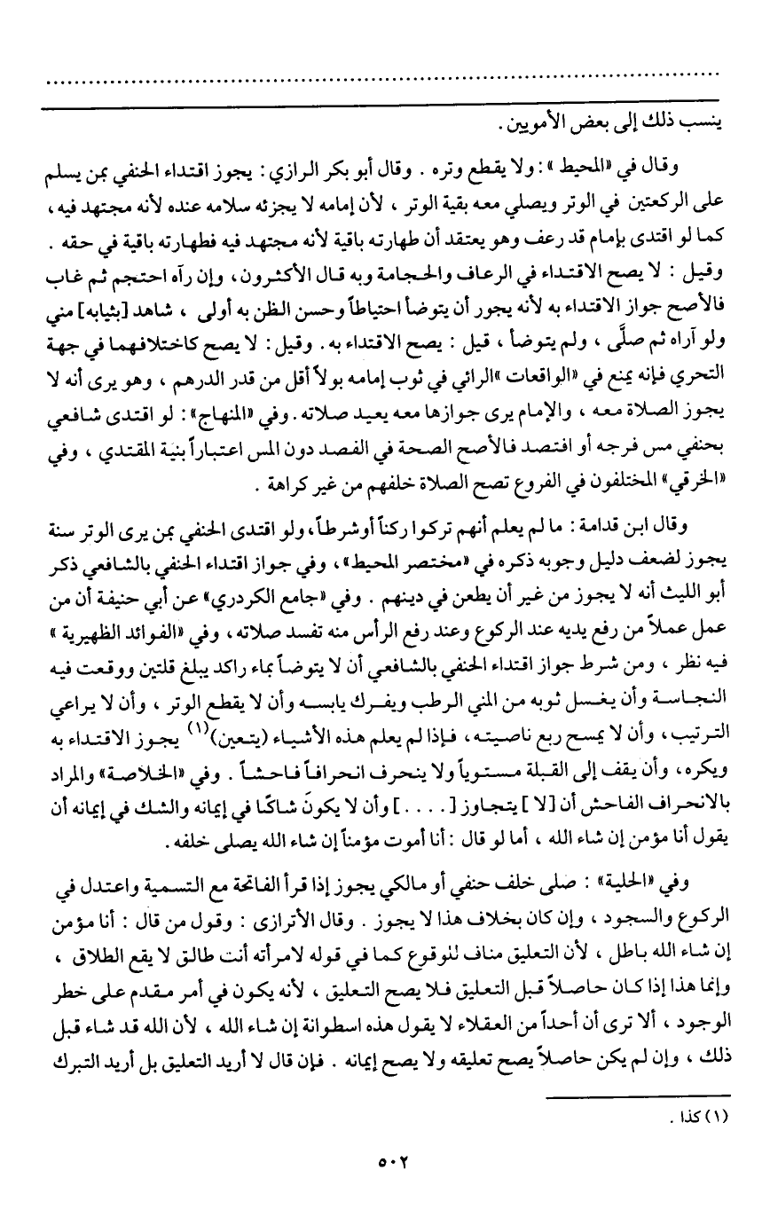 وقال ابن قدامة: ما لم يعلم أنهم تركوا ركنا أو شرطا، ولو اقتدى الحنفي بمن يرى الوتر سنة يجوز لضعف دليل وجوبه ذكره في " مختصر المحيط "، وفي جواز اقتداء الحنفي بالشافعي ذكر أبو الليث أنه لا يجوز من غير أن يطعن في دينهم. وفي " جامع الكردري " عن أبي حنيفة أن من عمل عملا من رفع يديه عند الركوع وعند رفع الرأس منه تفسد صلاته، وفي " الفوائد الظهيرية " فيه نظر، ومن شرط جواز اقتداء الحنفي بالشافعي أن لا يتوضأ بماء راكد يبلغ قلتين ووقعت فيه النجاسة وأن يغسل ثوبه من المني الرطب ويفرك يابسه وأن لا يقطع الوتر، وأن لا يراعي الترتيب، وأن لا يمسح ربع ناصيته، فإذا لم يعلم هذه الأشياء (يتعين) يجوز الاقتداء به ويكره، وأن يقف إلى القبلة مستويا ولا ينحرف انحرافا فاحشا. وفي " الخلاصة " والمراد بالانحراف الفاحش أن [لا] يتجاوز [....] وأن لا يكون شاكا في إيمانه، والشك في إيمانه أن يقول أنا مؤمن إن شاء الله، أما لو قال: أنا أموت مؤمنا إن شاء الله يصلي خلفه.